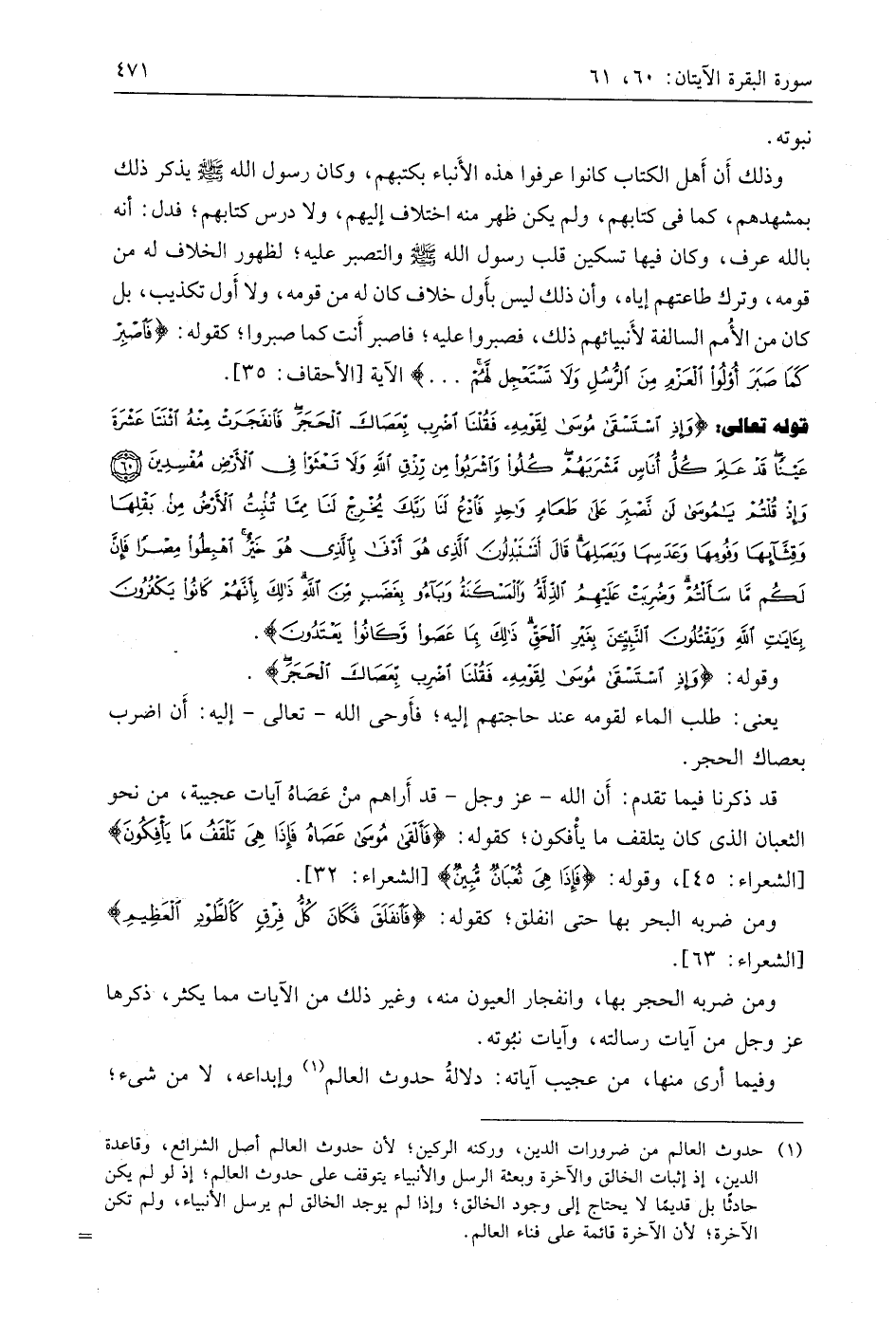 قوله تعالى: (وَإِذِ اسْتَسْقَى مُوسَى لِقَوْمِهِ فَقُلْنَا اضْرِبْ بِعَصَاكَ الْحَجَرَ فَانْفَجَرَتْ مِنْهُ اثْنَتَا عَشْرَةَ عَيْنًا قَدْ عَلِمَ كُلُّ أُنَاسٍ مَشْرَبَهُمْ كُلُوا وَاشْرَبُوا مِنْ رِزْقِ اللَّهِ وَلَا تَعْثَوْا فِي الْأَرْضِ مُفْسِدِينَ (60) وَإِذْ قُلْتُمْ يَا مُوسَى لَنْ نَصْبِرَ عَلَى طَعَامٍ وَاحِدٍ فَادْعُ لَنَا رَبَّكَ يُخْرِجْ لَنَا مِمَّا تُنْبِتُ الْأَرْضُ مِنْ بَقْلِهَا وَقِثَّائِهَا وَفُومِهَا وَعَدَسِهَا وَبَصَلِهَا قَالَ أَتَسْتَبْدِلُونَ الَّذِي هُوَ أَدْنَى بِالَّذِي هُوَ خَيْرٌ اهْبِطُوا مِصْرًا فَإِنَّ لَكُمْ مَا سَأَلْتُمْ وَضُرِبَتْ عَلَيْهِمُ الذِّلَّةُ وَالْمَسْكَنَةُ وَبَاءُوا بِغَضَبٍ مِنَ اللَّهِ ذَلِكَ بِأَنَّهُمْ كَانُوا يَكْفُرُونَ بِآيَاتِ اللَّهِ وَيَقْتُلُونَ النَّبِيِّينَ بِغَيْرِ الْحَقِّ ذَلِكَ بِمَا عَصَوْا وَكَانُوا يَعْتَدُونَ (61).