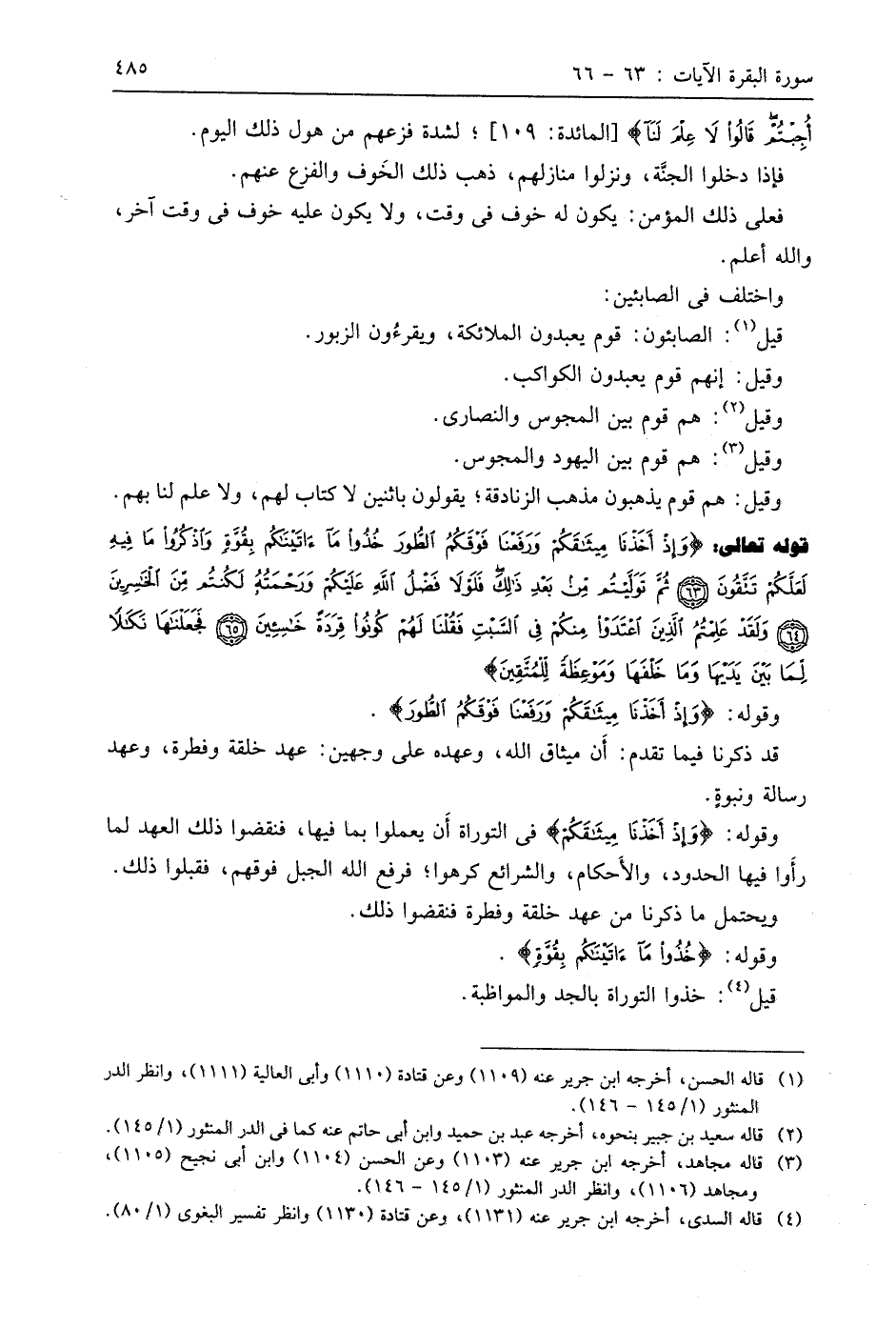 قوله تعالى: (وَإِذْ أَخَذْنَا مِيثَاقَكُمْ وَرَفَعْنَا فَوْقَكُمُ الطُّورَ خُذُوا مَا آتَيْنَاكُمْ بِقُوَّةٍ وَاذْكُرُوا مَا فِيهِ لَعَلَّكُمْ تَتَّقُونَ (63) ثُمَّ تَوَلَّيْتُمْ مِنْ بَعْدِ ذَلِكَ فَلَوْلَا فَضْلُ اللَّهِ عَلَيْكُمْ وَرَحْمَتُهُ لَكُنْتُمْ مِنَ الْخَاسِرِينَ (64) وَلَقَدْ عَلِمْتُمُ الَّذِينَ اعْتَدَوْا مِنْكُمْ فِي السَّبْتِ فَقُلْنَا لَهُمْ كُونُوا قِرَدَةً خَاسِئِينَ (65) فَجَعَلْنَاهَا نَكَالًا لِمَا بَيْنَ يَدَيْهَا وَمَا خَلْفَهَا وَمَوْعِظَةً لِلْمُتَّقِينَ (66)