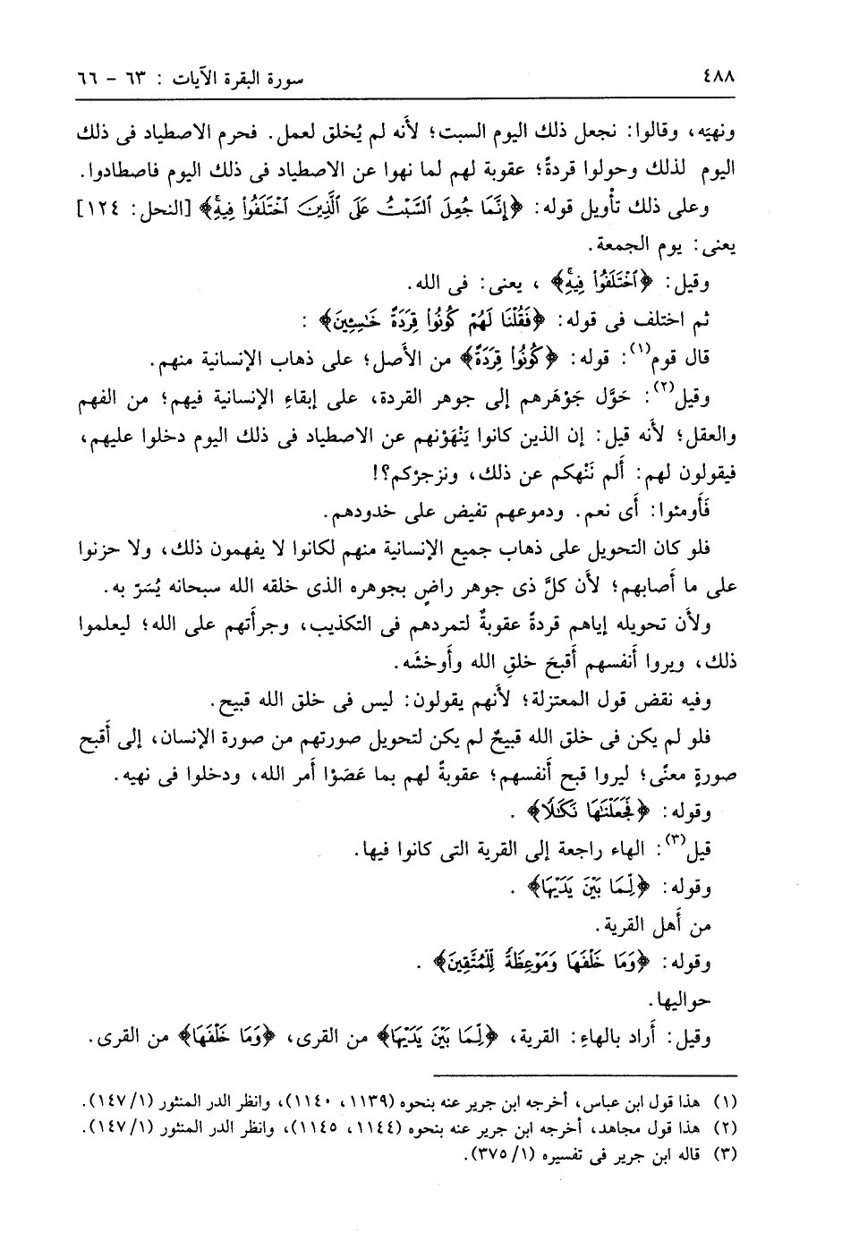 وقيل: حَوَّل جَوْهَرهم إلى جوهر القردة، على إبقاءِ الإنسانية فيهم؛ من الفهم والعقل؛ لأَنه قيل: إن الذين كانوا يَنْهَوْنهم عن الاصطياد في ذلك اليوم دخلوا عليهم، فيقولون لهم: أَلم نَنْهكم عن ذلك، ونزجزكم؟!