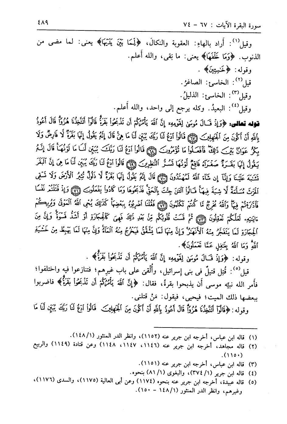قوله تعالى: (وَإِذْ قَالَ مُوسَى لِقَوْمِهِ إِنَّ اللَّهَ يَأْمُرُكُمْ أَنْ تَذْبَحُوا بَقَرَةً قَالُوا أَتَتَّخِذُنَا هُزُوًا قَالَ أَعُوذُ بِاللَّهِ أَنْ أَكُونَ مِنَ الْجَاهِلِينَ (67) قَالُوا ادْعُ لَنَا رَبَّكَ يُبَيِّنْ لَنَا مَا هِيَ قَالَ إِنَّهُ يَقُولُ إِنَّهَا بَقَرَةٌ لَا فَارِضٌ وَلَا بِكْرٌ عَوَانٌ بَيْنَ ذَلِكَ فَافْعَلُوا مَا تُؤْمَرُونَ (68) قَالُوا ادْعُ لَنَا رَبَّكَ يُبَيِّنْ لَنَا مَا لَوْنُهَا قَالَ إِنَّهُ يَقُولُ إِنَّهَا بَقَرَةٌ صَفْرَاءُ فَاقِعٌ لَوْنُهَا تَسُرُّ النَّاظِرِينَ (69) قَالُوا ادْعُ لَنَا رَبَّكَ يُبَيِّنْ لَنَا مَا هِيَ إِنَّ الْبَقَرَ تَشَابَهَ عَلَيْنَا وَإِنَّا إِنْ شَاءَ اللَّهُ لَمُهْتَدُونَ (70) قَالَ إِنَّهُ يَقُولُ إِنَّهَا بَقَرَةٌ لَا ذَلُولٌ تُثِيرُ الْأَرْضَ وَلَا تَسْقِي الْحَرْثَ مُسَلَّمَةٌ لَا شِيَةَ فِيهَا قَالُوا الْآنَ جِئْتَ بِالْحَقِّ فَذَبَحُوهَا وَمَا كَادُوا يَفْعَلُونَ (71) وَإِذْ قَتَلْتُمْ نَفْسًا فَادَّارَأْتُمْ فِيهَا وَاللَّهُ مُخْرِجٌ مَا كُنْتُمْ تَكْتُمُونَ (72) فَقُلْنَا اضْرِبُوهُ بِبَعْضِهَا كَذَلِكَ يُحْيِ اللَّهُ الْمَوْتَى وَيُرِيكُمْ آيَاتِهِ لَعَلَّكُمْ تَعْقِلُونَ (73) ثُمَّ قَسَتْ قُلُوبُكُمْ مِنْ بَعْدِ ذَلِكَ فَهِيَ كَالْحِجَارَةِ أَوْ أَشَدُّ قَسْوَةً وَإِنَّ مِنَ الْحِجَارَةِ لَمَا يَتَفَجَّرُ مِنْهُ الْأَنْهَارُ وَإِنَّ مِنْهَا لَمَا يَشَّقَّقُ فَيَخْرُجُ مِنْهُ الْمَاءُ وَإِنَّ مِنْهَا لَمَا يَهْبِطُ مِنْ خَشْيَةِ اللَّهِ وَمَا اللَّهُ بِغَافِلٍ عَمَّا تَعْمَلُونَ (74).