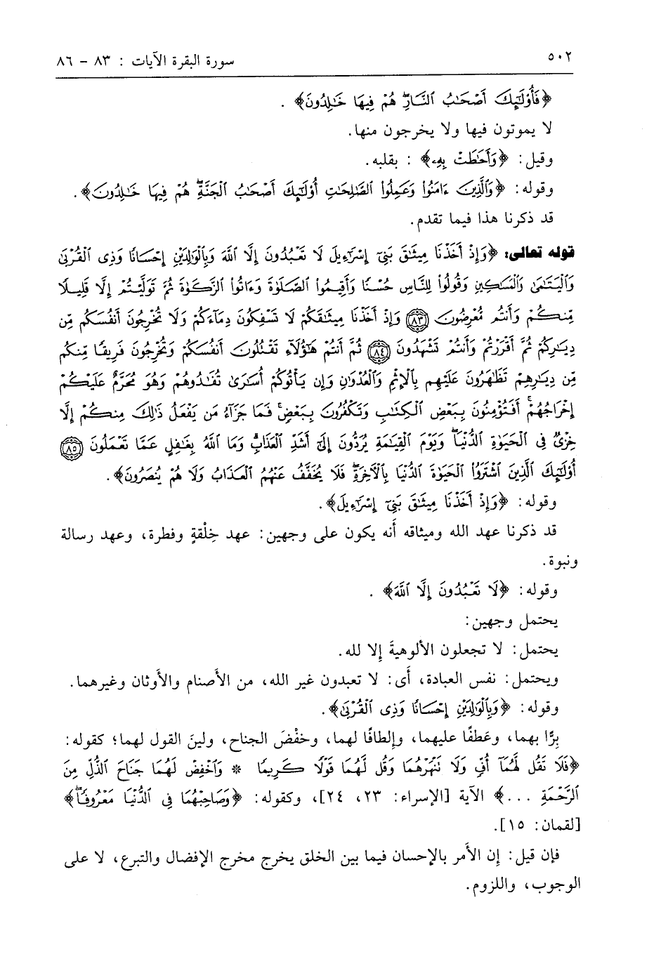 قوله تعالى: (وَإِذْ أَخَذْنَا مِيثَاقَ بَنِي إِسْرَائِيلَ لَا تَعْبُدُونَ إِلَّا اللَّهَ وَبِالْوَالِدَيْنِ إِحْسَانًا وَذِي الْقُرْبَى وَالْيَتَامَى وَالْمَسَاكِينِ وَقُولُوا لِلنَّاسِ حُسْنًا وَأَقِيمُوا الصَّلَاةَ وَآتُوا الزَّكَاةَ ثُمَّ تَوَلَّيْتُمْ إِلَّا قَلِيلًا مِنْكُمْ وَأَنْتُمْ مُعْرِضُونَ (83) وَإِذْ أَخَذْنَا مِيثَاقَكُمْ لَا تَسْفِكُونَ دِمَاءَكُمْ وَلَا تُخْرِجُونَ أَنْفُسَكُمْ مِنْ دِيَارِكُمْ ثُمَّ أَقْرَرْتُمْ وَأَنْتُمْ تَشْهَدُونَ (84) ثُمَّ أَنْتُمْ هَؤُلَاءِ تَقْتُلُونَ أَنْفُسَكُمْ وَتُخْرِجُونَ فَرِيقًا مِنْكُمْ مِنْ دِيَارِهِمْ تَظَاهَرُونَ عَلَيْهِمْ بِالْإِثْمِ وَالْعُدْوَانِ وَإِنْ يَأْتُوكُمْ أُسَارَى تُفَادُوهُمْ وَهُوَ مُحَرَّمٌ عَلَيْكُمْ إِخْرَاجُهُمْ أَفَتُؤْمِنُونَ بِبَعْضِ الْكِتَابِ وَتَكْفُرُونَ بِبَعْضٍ فَمَا جَزَاءُ مَنْ يَفْعَلُ ذَلِكَ مِنْكُمْ إِلَّا خِزْيٌ فِي الْحَيَاةِ الدُّنْيَا وَيَوْمَ الْقِيَامَةِ يُرَدُّونَ إِلَى أَشَدِّ الْعَذَابِ وَمَا اللَّهُ بِغَافِلٍ عَمَّا تَعْمَلُونَ (85) أُولَئِكَ الَّذِينَ اشْتَرَوُا الْحَيَاةَ الدُّنْيَا بِالْآخِرَةِ فَلَا يُخَفَّفُ عَنْهُمُ الْعَذَابُ وَلَا هُمْ يُنْصَرُونَ (86)