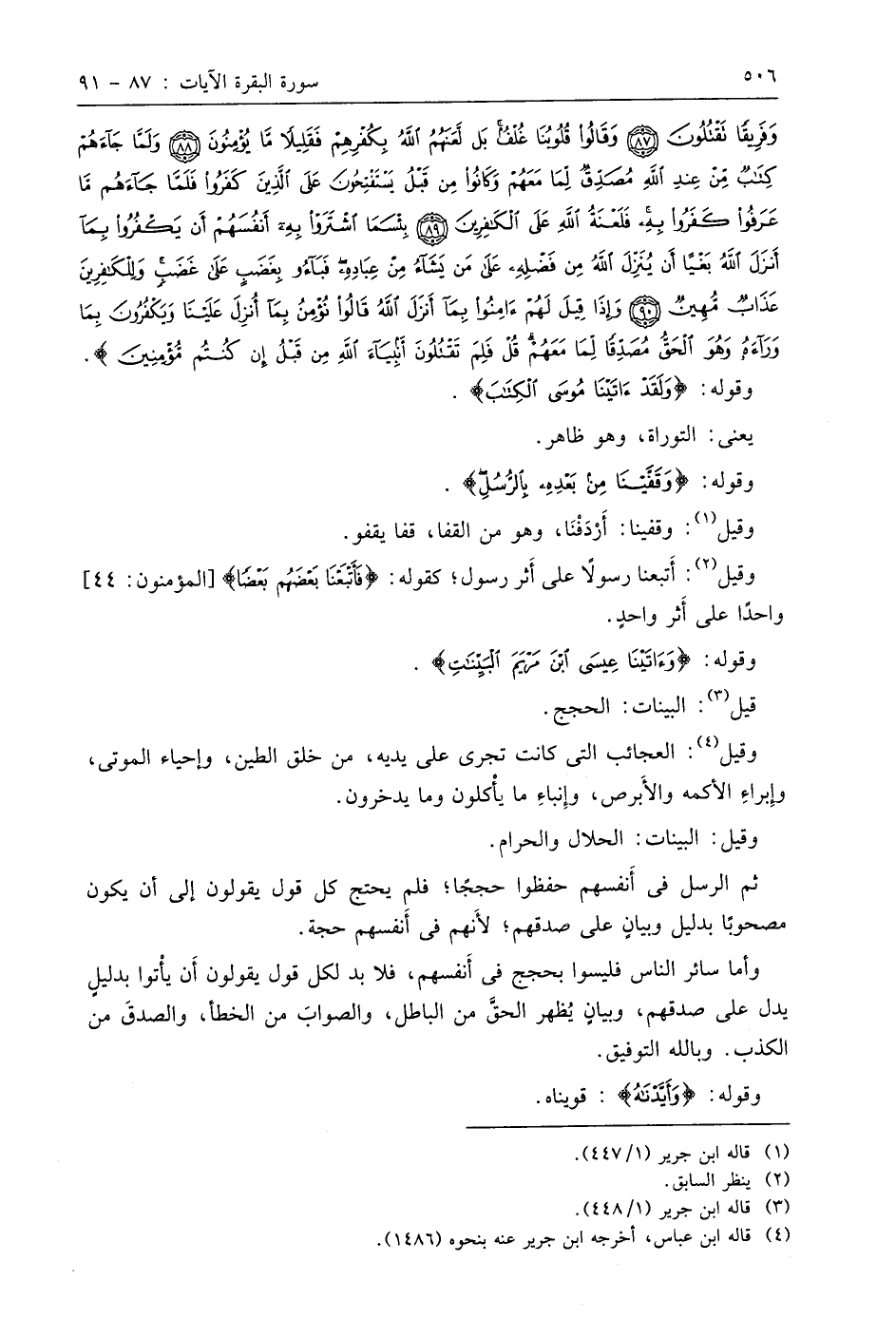وَفَرِيقًا تَقْتُلُونَ (87) وَقَالُوا قُلُوبُنَا غُلْفٌ بَلْ لَعَنَهُمُ اللَّهُ بِكُفْرِهِمْ فَقَلِيلًا مَا يُؤْمِنُونَ (88) وَلَمَّا جَاءَهُمْ كِتَابٌ مِنْ عِنْدِ اللَّهِ مُصَدِّقٌ لِمَا مَعَهُمْ وَكَانُوا مِنْ قَبْلُ يَسْتَفْتِحُونَ عَلَى الَّذِينَ كَفَرُوا فَلَمَّا جَاءَهُمْ مَا عَرَفُوا كَفَرُوا بِهِ فَلَعْنَةُ اللَّهِ عَلَى الْكَافِرِينَ (89) بِئْسَمَا اشْتَرَوْا بِهِ أَنْفُسَهُمْ أَنْ يَكْفُرُوا بِمَا أَنْزَلَ اللَّهُ بَغْيًا أَنْ يُنَزِّلَ اللَّهُ مِنْ فَضْلِهِ عَلَى مَنْ يَشَاءُ مِنْ عِبَادِهِ فَبَاءُوا بِغَضَبٍ عَلَى غَضَبٍ وَلِلْكَافِرِينَ عَذَابٌ مُهِينٌ (90) وَإِذَا قِيلَ لَهُمْ آمِنُوا بِمَا أَنْزَلَ اللَّهُ قَالُوا نُؤْمِنُ بِمَا أُنْزِلَ عَلَيْنَا وَيَكْفُرُونَ بِمَا وَرَاءَهُ وَهُوَ الْحَقُّ مُصَدِّقًا لِمَا مَعَهُمْ قُلْ فَلِمَ تَقْتُلُونَ أَنْبِيَاءَ اللَّهِ مِنْ قَبْلُ إِنْ كُنْتُمْ مُؤْمِنِينَ (91)