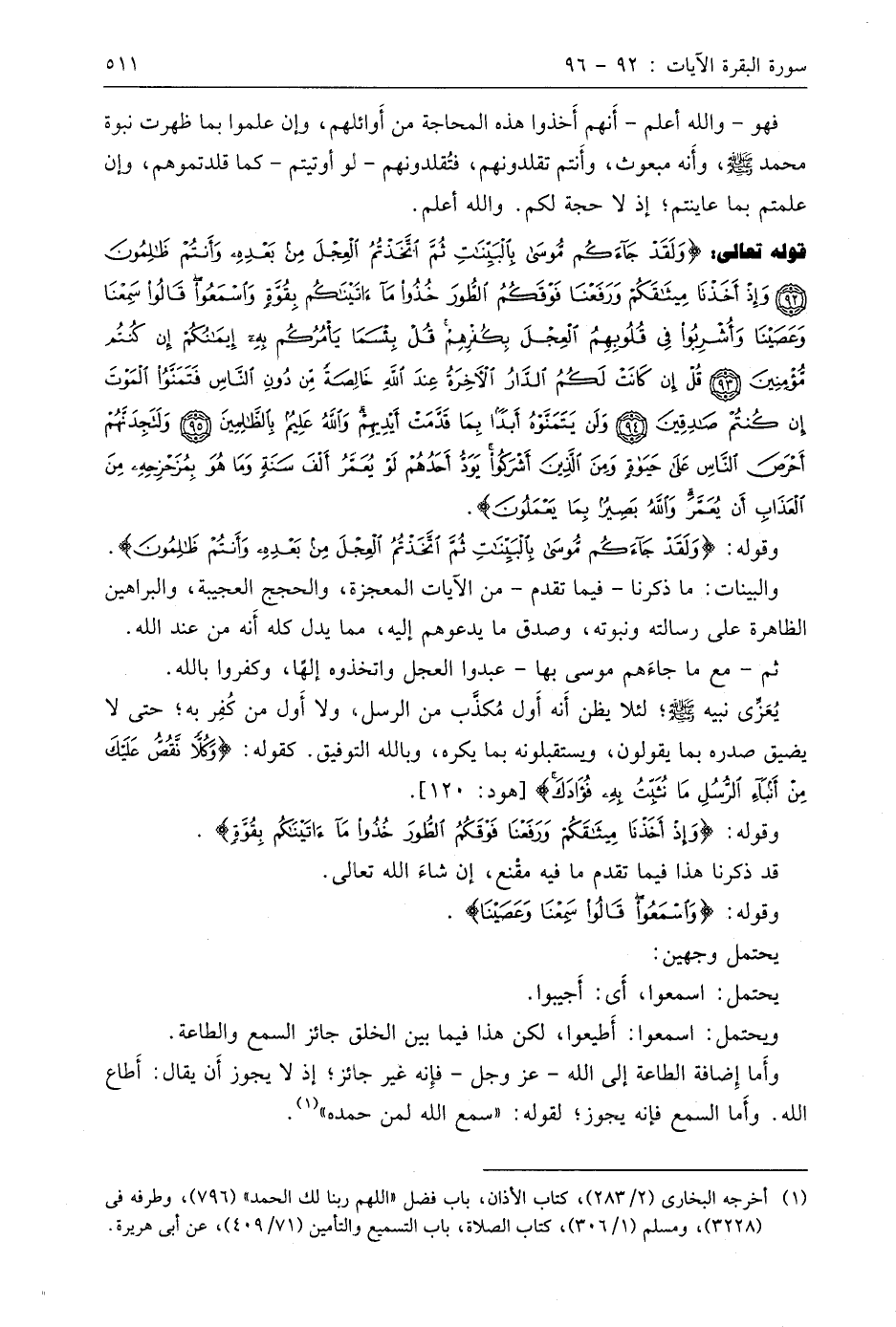 قوله تعالى: (وَلَقَدْ جَاءَكُمْ مُوسَى بِالْبَيِّنَاتِ ثُمَّ اتَّخَذْتُمُ الْعِجْلَ مِنْ بَعْدِهِ وَأَنْتُمْ ظَالِمُونَ (92) وَإِذْ أَخَذْنَا مِيثَاقَكُمْ وَرَفَعْنَا فَوْقَكُمُ الطُّورَ خُذُوا مَا آتَيْنَاكُمْ بِقُوَّةٍ وَاسْمَعُوا قَالُوا سَمِعْنَا وَعَصَيْنَا وَأُشْرِبُوا فِي قُلُوبِهِمُ الْعِجْلَ بِكُفْرِهِمْ قُلْ بِئْسَمَا يَأْمُرُكُمْ بِهِ إِيمَانُكُمْ إِنْ كُنْتُمْ مُؤْمِنِينَ (93) قُلْ إِنْ كَانَتْ لَكُمُ الدَّارُ الْآخِرَةُ عِنْدَ اللَّهِ خَالِصَةً مِنْ دُونِ النَّاسِ فَتَمَنَّوُا الْمَوْتَ إِنْ كُنْتُمْ صَادِقِينَ (94) وَلَنْ يَتَمَنَّوْهُ أَبَدًا بِمَا قَدَّمَتْ أَيْدِيهِمْ وَاللَّهُ عَلِيمٌ بِالظَّالِمِينَ (95) وَلَتَجِدَنَّهُمْ أَحْرَصَ النَّاسِ عَلَى حَيَاةٍ وَمِنَ الَّذِينَ أَشْرَكُوا يَوَدُّ أَحَدُهُمْ لَوْ يُعَمَّرُ أَلْفَ سَنَةٍ وَمَا هُوَ بِمُزَحْزِحِهِ مِنَ الْعَذَابِ أَنْ يُعَمَّرَ وَاللَّهُ بَصِيرٌ بِمَا يَعْمَلُونَ (96)