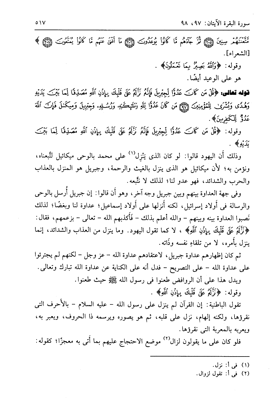 وقوله: (قُلْ مَنْ كَانَ عَدُوًّا لِجِبْرِيلَ فَإِنَّهُ نَزَّلَهُ عَلَى قَلْبِكَ بِإِذْنِ اللَّهِ مُصَدِّقًا لِمَا بَيْنَ يَدَيْهِ).
