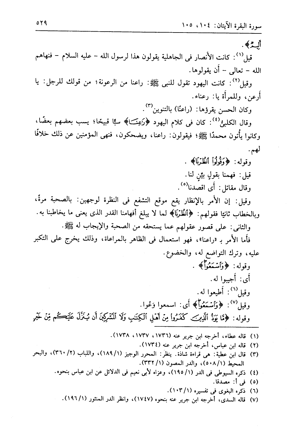 وقال الكلبي: كان في كلام اليهود (رَاعِنَا) سبًّا قبيحًا؛ يسب بعضهم بعضًا، وكانوا يأتون محمدًا - صَلَّى اللَّهُ عَلَيهِ وَسَلَّمَ -؛ فيقولون: راعنا، ويضحكون، فنهى المؤمنين عن ذلك خلافًا لهم.