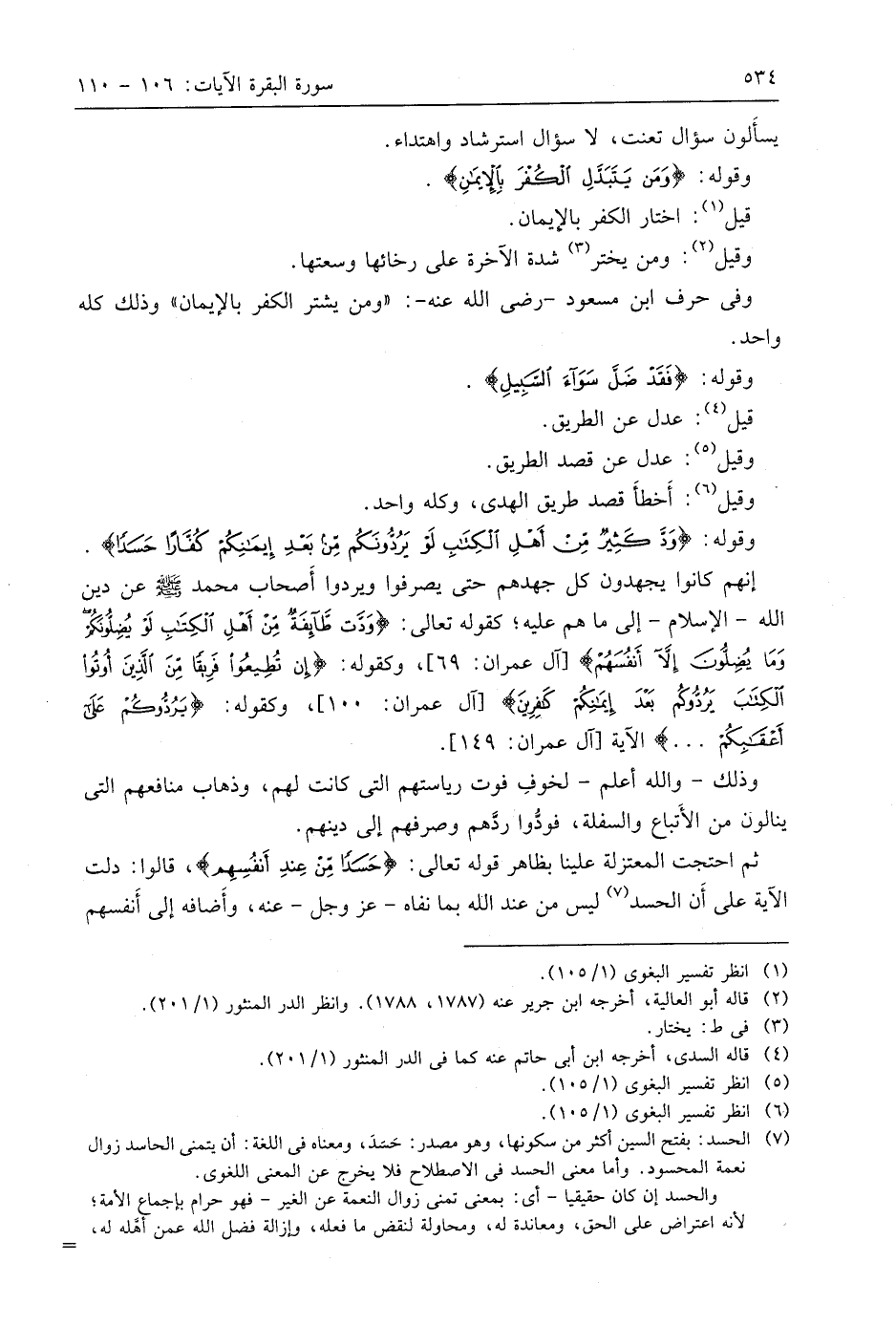 وقوله: (وَدَّ كَثِيرٌ مِنْ أَهْلِ الْكِتَابِ لَوْ يَرُدُّونَكُمْ مِنْ بَعْدِ إِيمَانِكُمْ كُفَّارًا حَسَدًا (109)