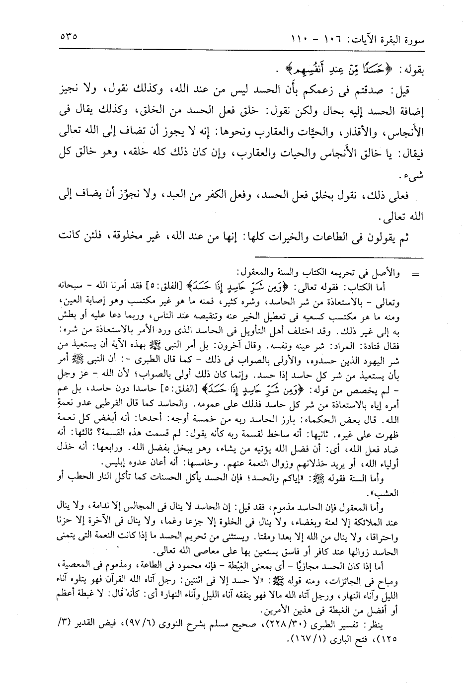 قيل: صدقتم في زعمكم بأَن الحسد ليس من عند اللَّه، وكذلك نقول، ولا نجيز إضافة الحسد إليه بحال ولكن نقول: خلق فعل الحسد من الخلق، وكذلك يقال في الأَنجاس، والأقذار، والحيَّات والعقارب ونحوها: إِنه لا يجوز أن تضاف إلى اللَّه تعالى فيقال: يا خالق الأَنجاس والحيات والعقارب، وإن كان ذلك كله خلقه، وهو خالق كل شيء.