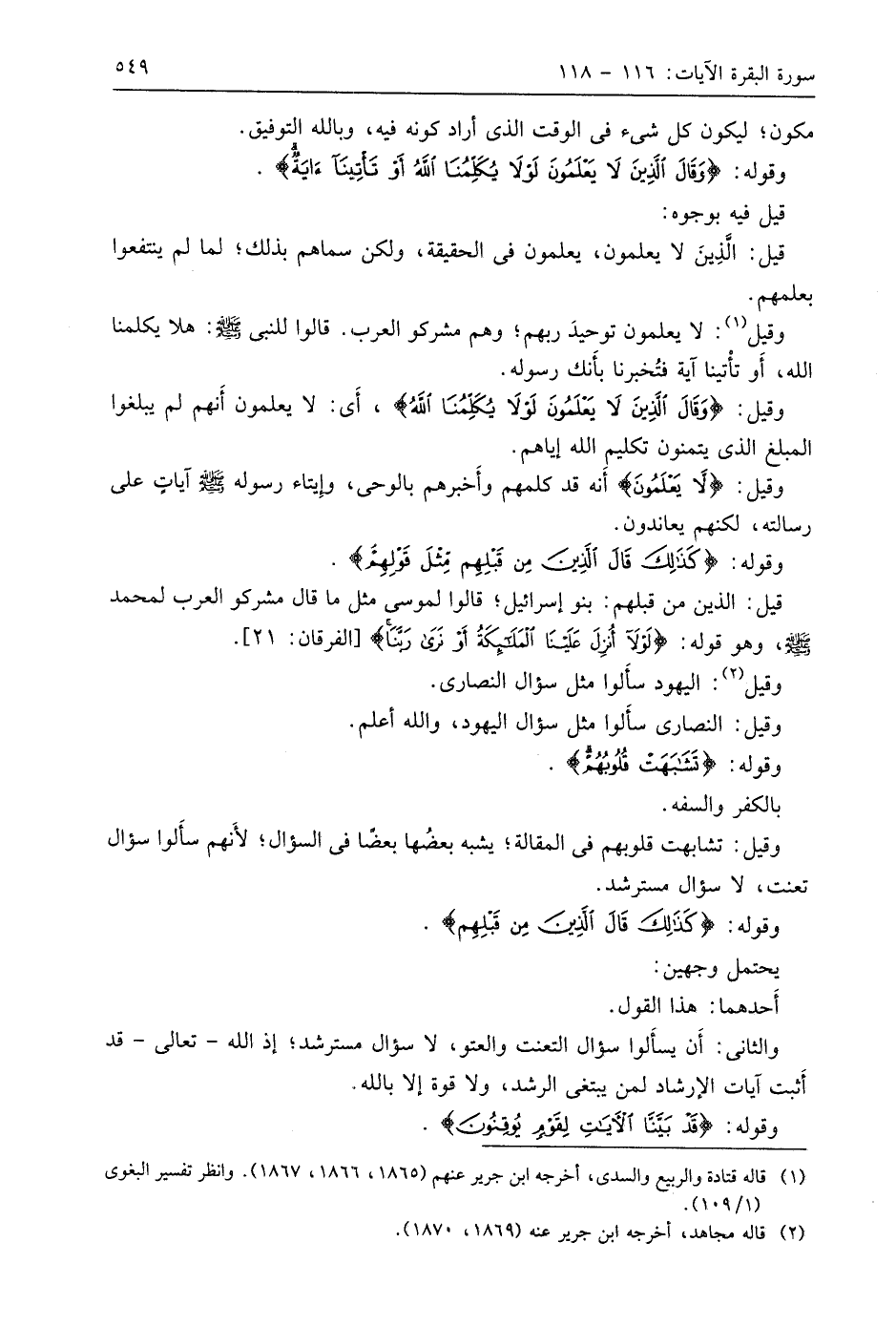وقوله: (وَقَالَ الَّذِينَ لَا يَعْلَمُونَ لَوْلَا يُكَلِّمُنَا اللَّهُ أَوْ تَأْتِينَا آيَةٌ (118)