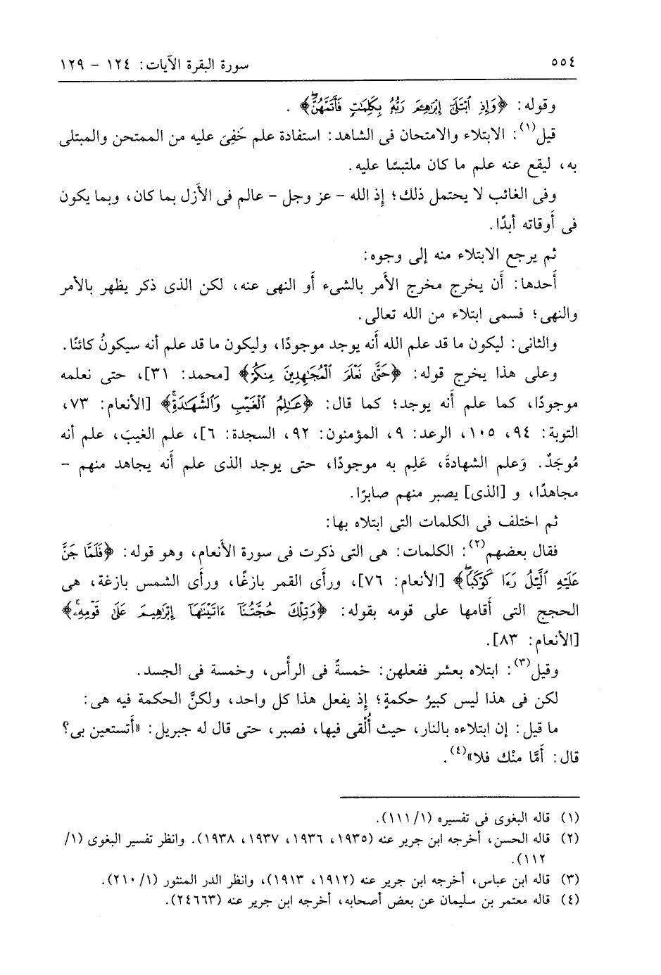 وقوله: (وَإِذِ ابْتَلَى إِبْرَاهِيمَ رَبُّهُ بِكَلِمَاتٍ فَأَتَمَّهُنَّ (124)