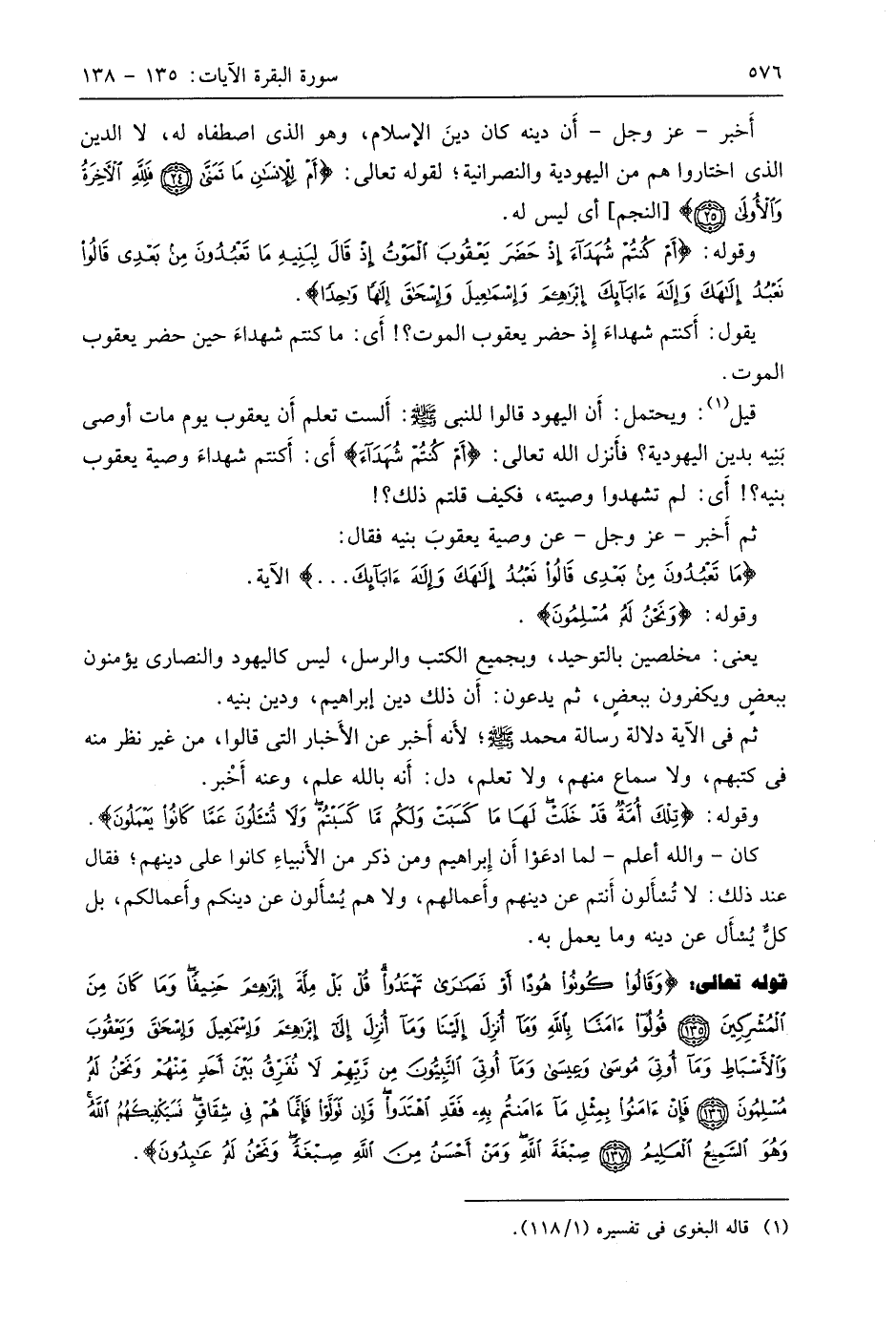 قوله تعالى: (وَقَالُوا كُونُوا هُودًا أَوْ نَصَارَى تَهْتَدُوا قُلْ بَلْ مِلَّةَ إِبْرَاهِيمَ حَنِيفًا وَمَا كَانَ مِنَ الْمُشْرِكِينَ (135) قُولُوا آمَنَّا بِاللَّهِ وَمَا أُنْزِلَ إِلَيْنَا وَمَا أُنْزِلَ إِلَى إِبْرَاهِيمَ وَإِسْمَاعِيلَ وَإِسْحَاقَ وَيَعْقُوبَ وَالْأَسْبَاطِ وَمَا أُوتِيَ مُوسَى وَعِيسَى وَمَا أُوتِيَ النَّبِيُّونَ مِنْ رَبِّهِمْ لَا نُفَرِّقُ بَيْنَ أَحَدٍ مِنْهُمْ وَنَحْنُ لَهُ مُسْلِمُونَ (136) فَإِنْ آمَنُوا بِمِثْلِ مَا آمَنْتُمْ بِهِ فَقَدِ اهْتَدَوْا وَإِنْ تَوَلَّوْا فَإِنَّمَا هُمْ فِي شِقَاقٍ فَسَيَكْفِيكَهُمُ اللَّهُ وَهُوَ السَّمِيعُ الْعَلِيمُ (137) صِبْغَةَ اللَّهِ وَمَنْ أَحْسَنُ مِنَ اللَّهِ صِبْغَةً وَنَحْنُ لَهُ عَابِدُونَ (138)