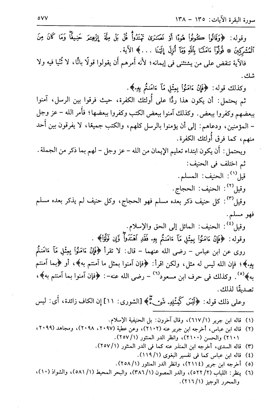 وقوله: (وَقَالُوا كُونُوا هُودًا أَوْ نَصَارَى تَهْتَدُوا قُلْ بَلْ مِلَّةَ إِبْرَاهِيمَ حَنِيفًا وَمَا كَانَ مِنَ الْمُشْرِكِينَ (135) قُولُوا آمَنَّا بِاللَّهِ وَمَا أُنْزِلَ إِلَيْنَا. . .) الآية.