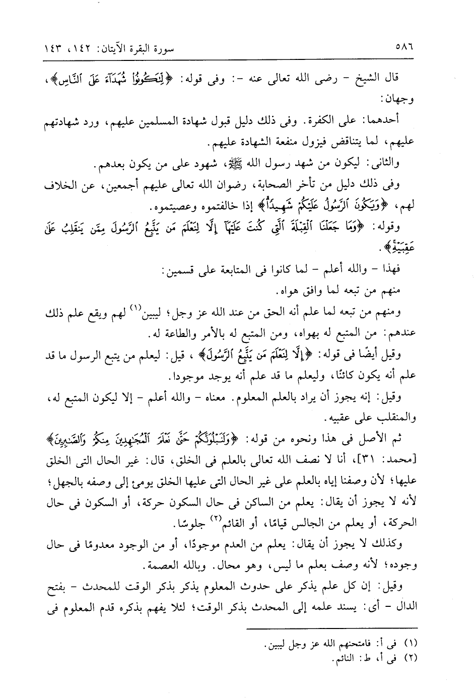 ثم الأصل في هذا ونحوه من قوله: (وَلَنَبْلُوَنَّكُمْ حَتَّى نَعْلَمَ الْمُجَاهِدِينَ مِنْكُمْ وَالصَّابِرِينَ) أنا لا نصف اللَّه تعالى بالعلم في الخلق، قال: غير الحال التي الخلق عليها؛ لأن وصفنا إياه بالعلم على غير الحال التي عليها الخلق يومئ إلى وصفه بالجهل؛ لأنه لا يجوز أن يقال: يعلم من الساكن في حال السكون حركة، أو السكون في حال الحركة، أو يعلم من الجالس قيامًا، أو القائم جلوسًا.