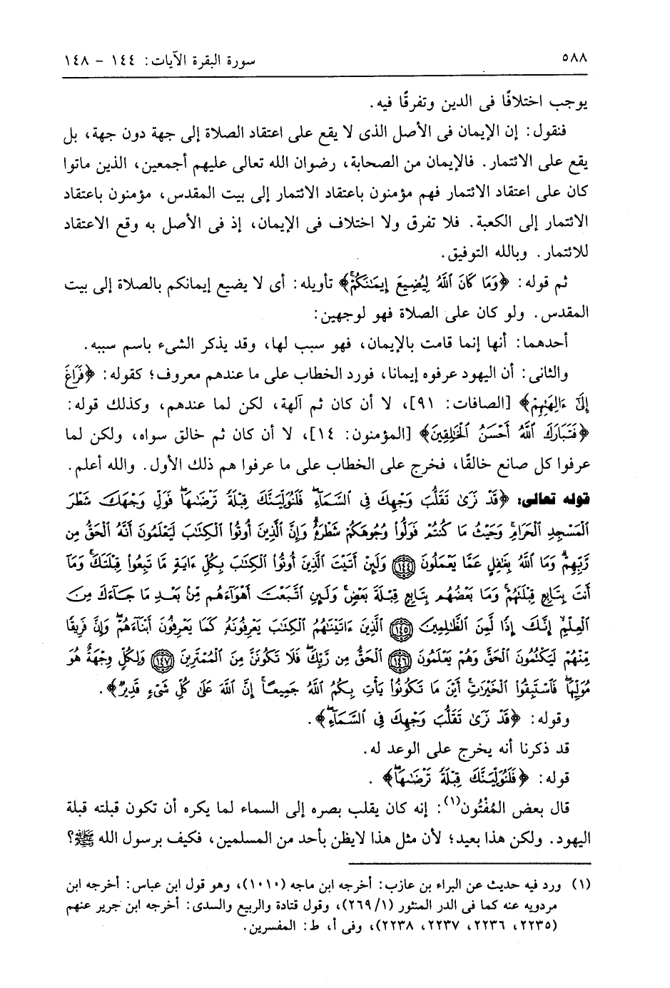 قوله تعالى: (قَدْ نَرَى تَقَلُّبَ وَجْهِكَ فِي السَّمَاءِ فَلَنُوَلِّيَنَّكَ قِبْلَةً تَرْضَاهَا فَوَلِّ وَجْهَكَ شَطْرَ الْمَسْجِدِ الْحَرَامِ وَحَيْثُ مَا كُنْتُمْ فَوَلُّوا وُجُوهَكُمْ شَطْرَهُ وَإِنَّ الَّذِينَ أُوتُوا الْكِتَابَ لَيَعْلَمُونَ أَنَّهُ الْحَقُّ مِنْ رَبِّهِمْ وَمَا اللَّهُ بِغَافِلٍ عَمَّا يَعْمَلُونَ (144) وَلَئِنْ أَتَيْتَ الَّذِينَ أُوتُوا الْكِتَابَ بِكُلِّ آيَةٍ مَا تَبِعُوا قِبْلَتَكَ وَمَا أَنْتَ بِتَابِعٍ قِبْلَتَهُمْ وَمَا بَعْضُهُمْ بِتَابِعٍ قِبْلَةَ بَعْضٍ وَلَئِنِ اتَّبَعْتَ أَهْوَاءَهُمْ مِنْ بَعْدِ مَا جَاءَكَ مِنَ الْعِلْمِ إِنَّكَ إِذًا لَمِنَ الظَّالِمِينَ (145) الَّذِينَ آتَيْنَاهُمُ الْكِتَابَ يَعْرِفُونَهُ كَمَا يَعْرِفُونَ أَبْنَاءَهُمْ وَإِنَّ فَرِيقًا مِنْهُمْ لَيَكْتُمُونَ الْحَقَّ وَهُمْ يَعْلَمُونَ (146) الْحَقُّ مِنْ رَبِّكَ فَلَا تَكُونَنَّ مِنَ الْمُمْتَرِينَ (147) وَلِكُلٍّ وِجْهَةٌ هُوَ مُوَلِّيهَا فَاسْتَبِقُوا الْخَيْرَاتِ أَيْنَ مَا تَكُونُوا يَأْتِ بِكُمُ اللَّهُ جَمِيعًا إِنَّ اللَّهَ عَلَى كُلِّ شَيْءٍ قَدِيرٌ (148)