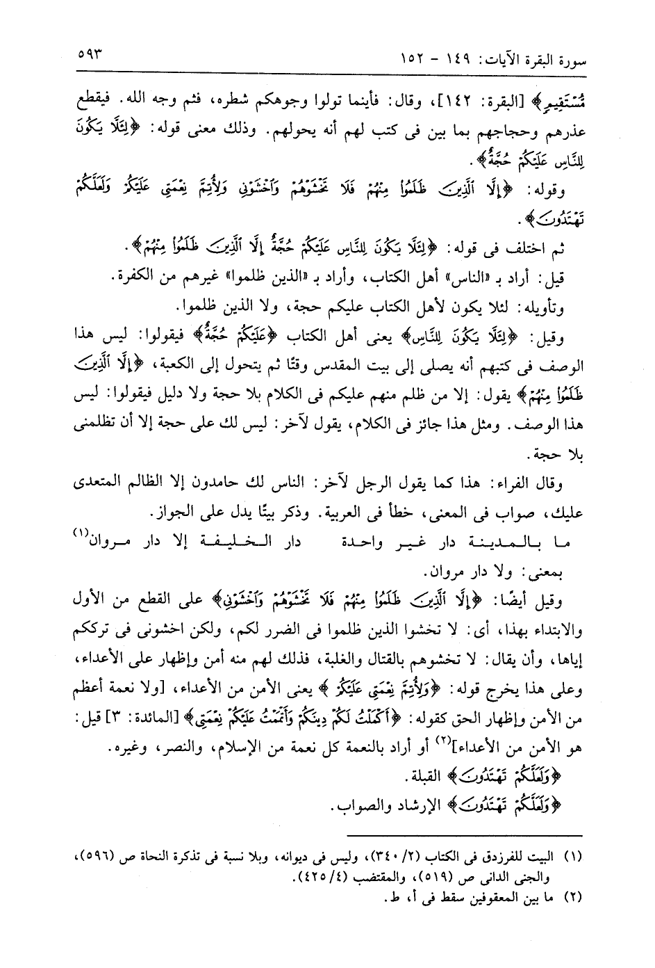 وقيل أيضًا: (إِلَّا الَّذِينَ ظَلَمُوا مِنْهُمْ فَلَا تَخْشَوْهُمْ وَاخْشَوْنِي) على القطع من الأول والابتداء بهذا، أي: لا تخشوا الذين ظلموا في الضرر لكم، ولكن اخشوني في ترككم إياها، وأن يقال: لا تخشوهم بالقتال والغلبة، فذلك لهم منه أمن وإظهار على الأعداء، وعلى هذا يخرج قوله: (وَلِأُتِمَّ نِعْمَتِي عَلَيْكُمْ) يعني الأمن من الأعداء، ولا نعمة أعظم من الأمن وإظهار الحق كقوله: (الْيَوْمَ أَكْمَلْتُ لَكُمْ دِينَكُمْ وَأَتْمَمْتُ عَلَيْكُمْ نِعْمَتِي)، قيل: هو الأمن من الأعداء، أو أراد بالنعمة كل نعمة من الإسلام، والنصر، وغيره.
