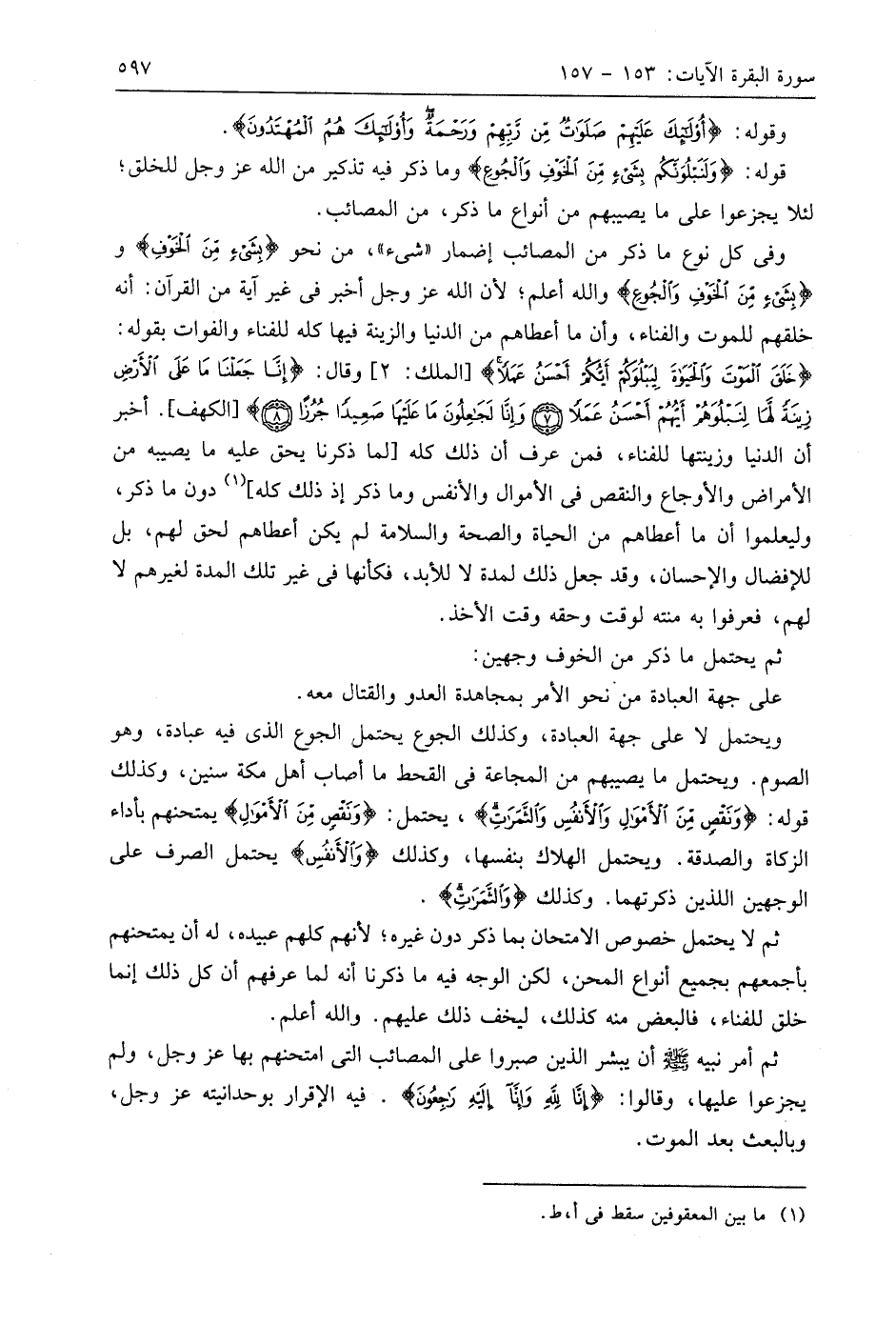 وفي كل نوع ما ذكر من المصائب إضمار " شيء "، من نحو (بِشَيْءٍ مِنَ الْخَوْفِ) و (بِشَيْءٍ مِنَ الْخَوْفِ وَالْجُوعِ) واللَّه أعلم؛ لأن اللَّه عَزَّ وَجَلَّ أخبر في غير آية من القرآن: أنه خلقهم للموت والفناء، وأن ما أعطاهم من الدنيا والزينة فيها كله للفناء والفوات بقوله: (خَلَقَ الْمَوْتَ وَالْحَيَاةَ لِيَبْلُوَكُمْ أَيُّكُمْ أَحْسَنُ عَمَلًا)، وقال: (إِنَّا جَعَلْنَا مَا عَلَى الْأَرْضِ زِينَةً لَهَا لِنَبْلُوَهُمْ أَيُّهُمْ أَحْسَنُ عَمَلًا (7) وَإِنَّا لَجَاعِلُونَ مَا عَلَيْهَا صَعِيدًا جُرُزًا (8). أخبر أن الدنيا وزينتها للفناء، فمن عرف أن ذلك كله لما ذكرنا يحق عليه ما يصيبه من الأمراض والأوجاع والنقص في الأموال والأنفس وما ذكر إذ ذلك كله، دون ما ذكر، وليعلموا أن ما أعطاهم من الحياة والصحة والسلامة لم يكن أعطاهم لحق لهم، بل للإفضال والإحسان، وقد جعل ذلك لمدة لا للأبد، فكأنه، في غير تلك المدة لغيرهم لا لهم، فعرفوا به منته لوقت وحقه وقت الأخذ.
