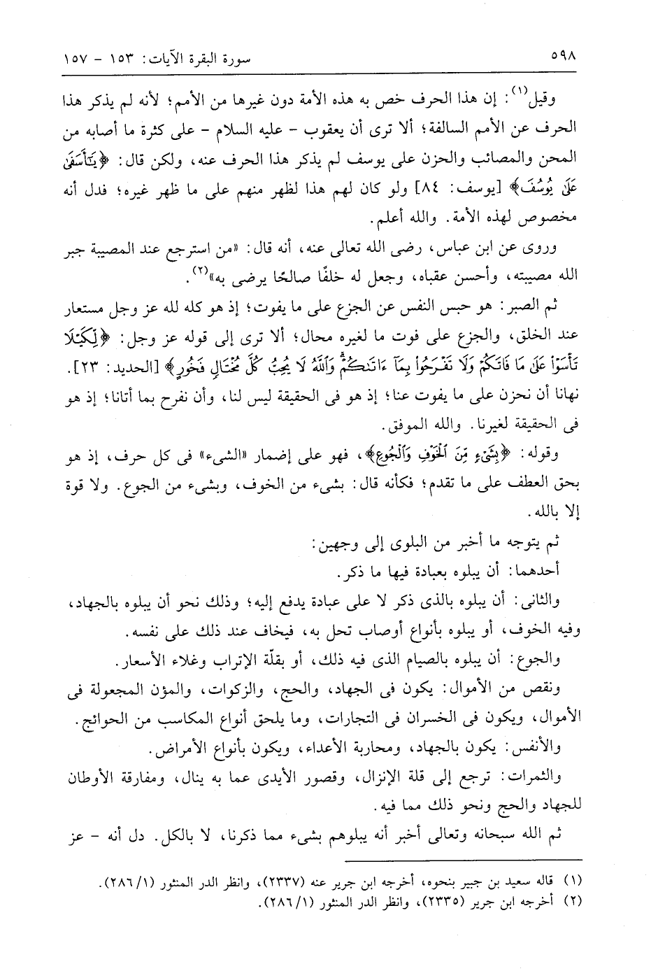 ثم الصبر: هو حبس النفس عن الجزع على ما يفوت؛ إذ هو كله لله عَزَّ وَجَلَّ مستعار عند الخلق، والجزع على فوت ما لغيره محال؛ ألا ترى إلى قوله عَزَّ وَجَلَّ: (لِكَيْلَا تَأْسَوْا عَلَى مَا فَاتَكُمْ وَلَا تَفْرَحُوا بِمَا آتَاكُمْ وَاللَّهُ لَا يُحِبُّ كُلَّ مُخْتَالٍ فَخُورٍ (23). نهانا أن نحزن على ما يفوت عنا؛ إذ هو في الحقيقة ليس لنا، وأن نفرح بما أتانا؛ إذ هو في الحقيقة لغيرنا. واللَّه الموفق.