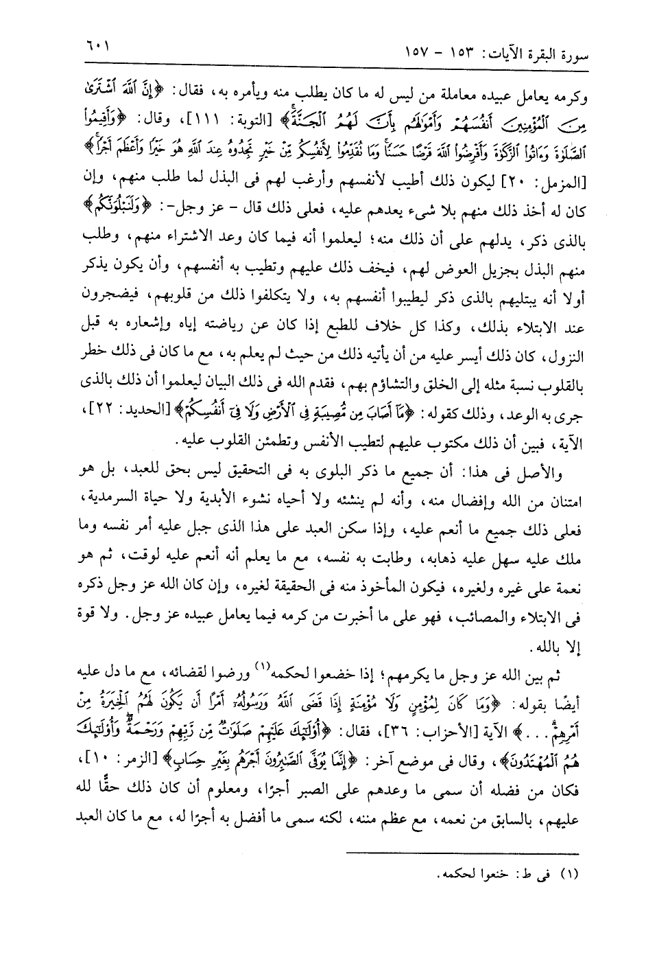 ثم بين اللَّه عَزَّ وَجَلَّ ما يكرمهم؛ إذا خضعوا لحكمه ورضوا لقضائه، مع ما دل عليه أيضًا بقوله: (وَمَا كَانَ لِمُؤْمِنٍ وَلَا مُؤْمِنَةٍ إِذَا قَضَى اللَّهُ وَرَسُولُهُ أَمْرًا أَنْ يَكُونَ لَهُمُ الْخِيَرَةُ مِنْ أَمْرِهِمْ. . .) الآية، فقال: (أُولَئِكَ عَلَيْهِمْ صَلَوَاتٌ مِنْ رَبِّهِمْ وَرَحْمَةٌ وَأُولَئِكَ هُمُ الْمُهْتَدُونَ (157)، وقال في موضع آخر: (إِنَّمَا يُوَفَّى الصَّابِرُونَ أَجْرَهُمْ بِغَيْرِ حِسَابٍ)، فكان من فضله أن سمى ما وعدهم على الصبر أجرًا، ومعلوم أن كان ذلك حقا لله عليهم، بالسابق من نعمه، مع عظم مننه، لكنه سمى ما أفضل به أجرًا له، مع ما كان العبد