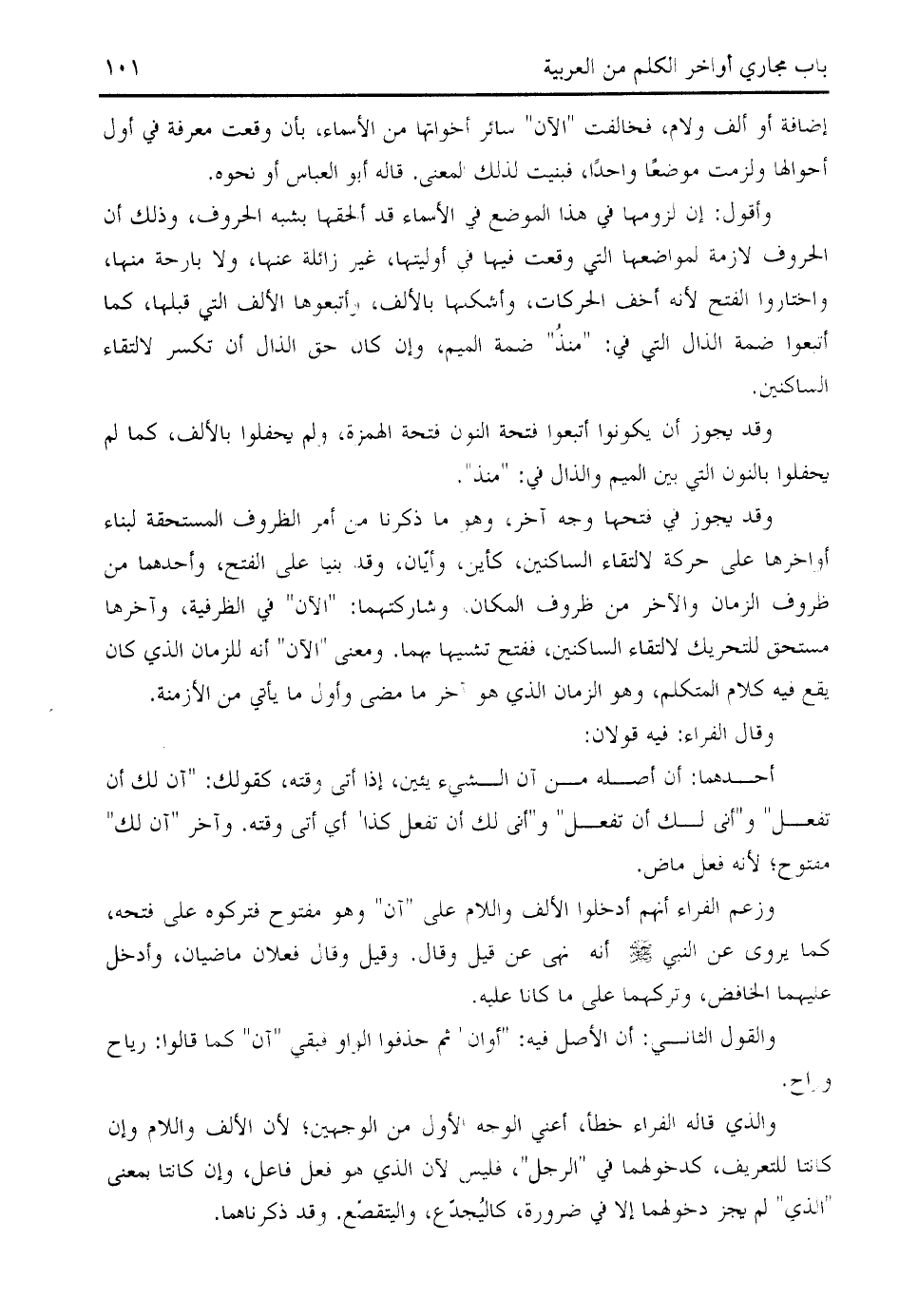 وقد يجوز في فتحها وجه آخر، وهو ما ذكرنا من أمر الظروف المستحقة لبناء أواخرها على حركة لالتقاء الساكنين، كأين، وأيّان، وقد بنيا على الفتح، وأحدهما من ظروف الزمان والآخر من ظروف المكان، وشاركتهما: " الآن " في الظرفية، وآخرها مستحق للتحريك لالتقاء الساكنين، ففتح تشبيها بهما. ومعنى " الآن " أنه للزمان الذي كان يقع فيه كلام المتكلم، وهو الزمان الذي هو آخر ما مضى وأول ما يأتي من الأزمنة.