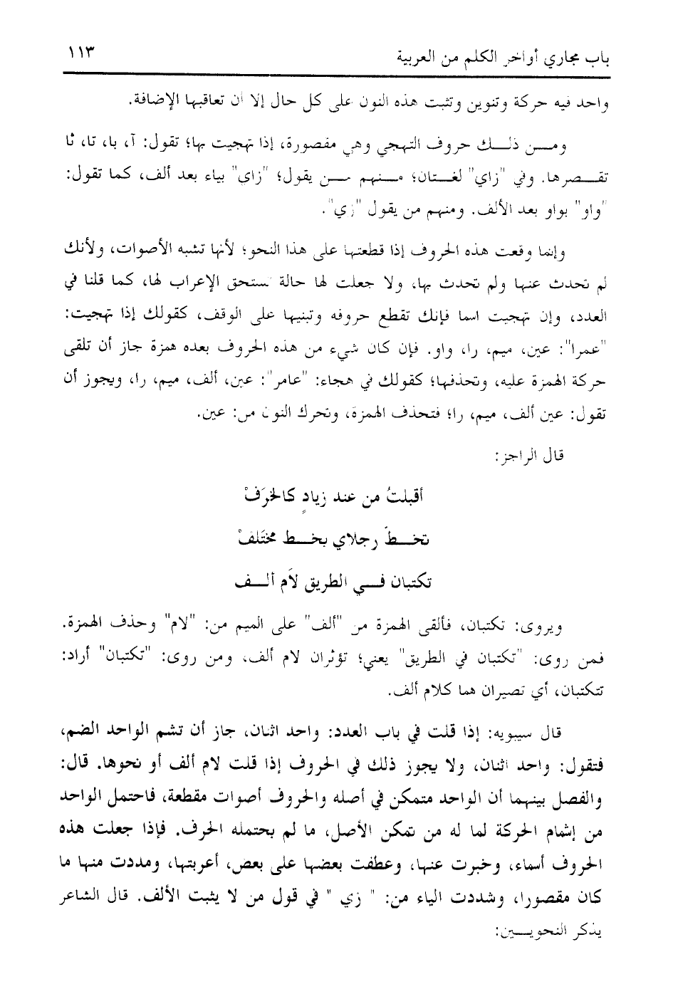 والفصل بينهما أن الواحد متمكن في أصله والحروف أصوات مقطعة، فاحتمل الواحد من إشمام الحركة لما له من تمكن الأصل، ما لم يحتمله الحرف. فإذا جعلت هذه الحروف أسماء، وخبرت عنها، وعطفت بعضها على بعض، أعربتها، ومددت منها ما كان مقصورا، وشددت الياء من: " زي " في قول من لا يثبت الألف. قال الشاعر يذكر النحويين: