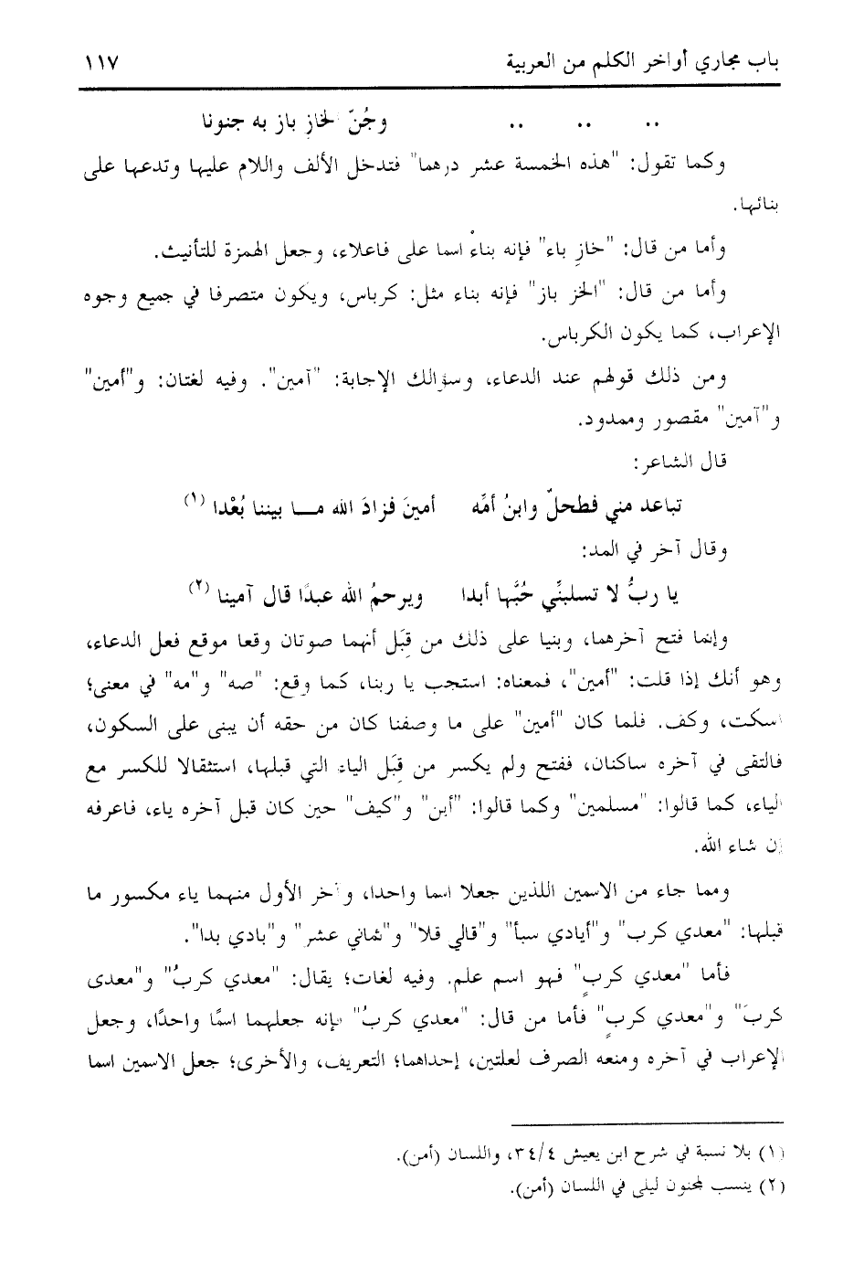 ومما جاء من الاسمين اللذين جعلا اسما واحدا، وآخر الأول منهما ياء مكسور ما قبلها: " معدي كرب " و " أيادي سبأ " و " قالي قلا " و " ثماني عشر " و " بادي بدا ".
