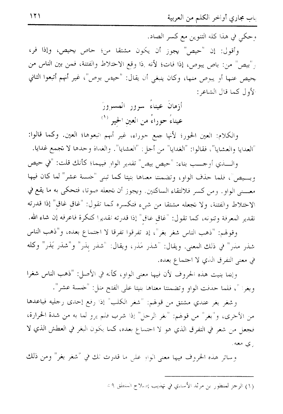 وأقول: إن " حيص " يجوز أن يكون مشتقا من؛ حاص يحيص، وإذا فر، و " بيص " من: باص يبوص، إذا فات؛ لأنه