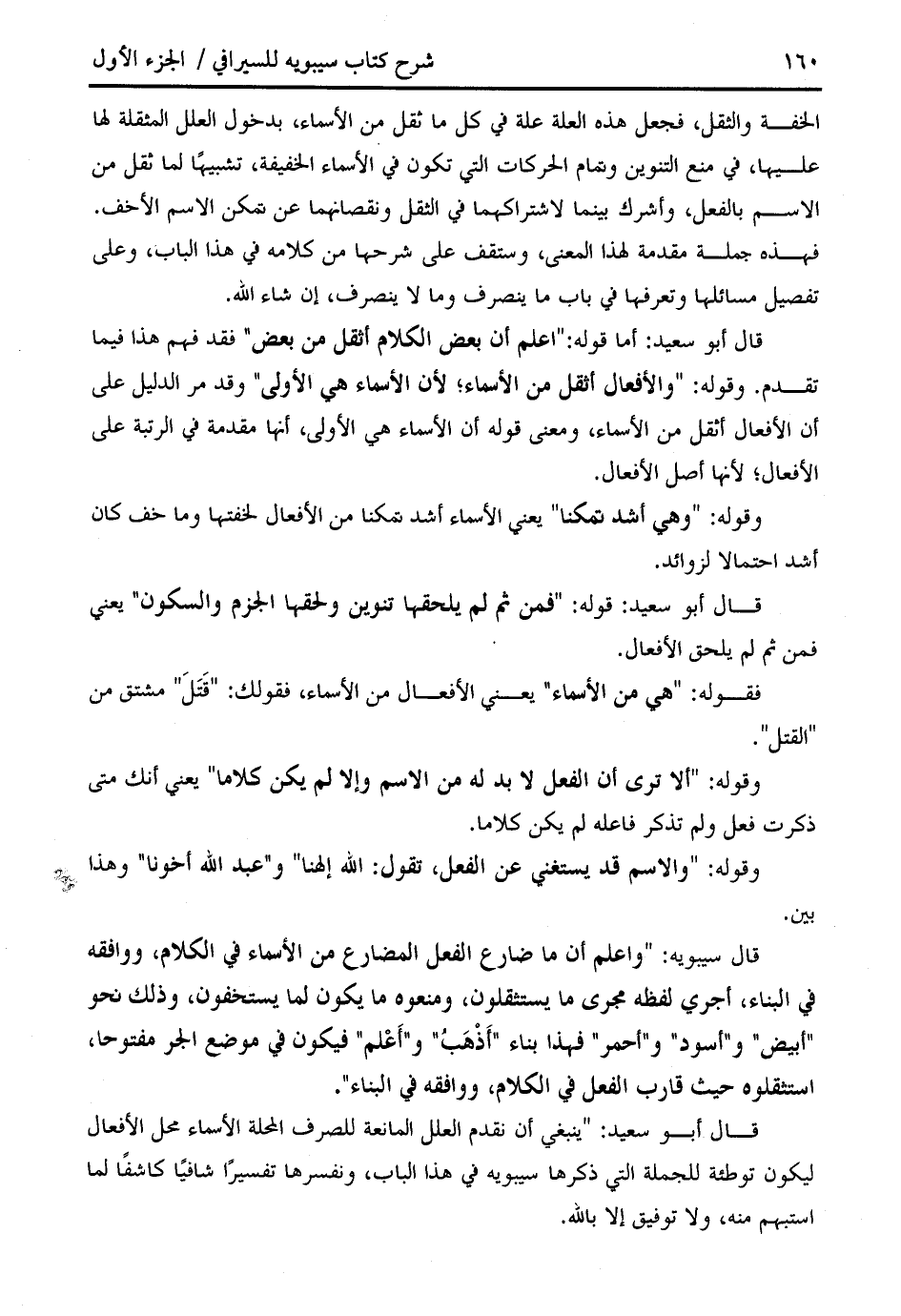 قال أبو سعيد: أما قوله: " اعلم أن بعض الكلام أثقل من بعض " فقد فهم هذا فيما تقدم. وقوله: " والأفعال أثقل من الأسماء؛ لأن الأسماء هي الأولى " وقد مر الدليل على أن الأفعال أثقل من الأسماء، ومعنى قوله أن الأسماء هي الأولى، أنها مقدمة في الرتبة على الأفعال؛ لأنها أصل الأفعال.