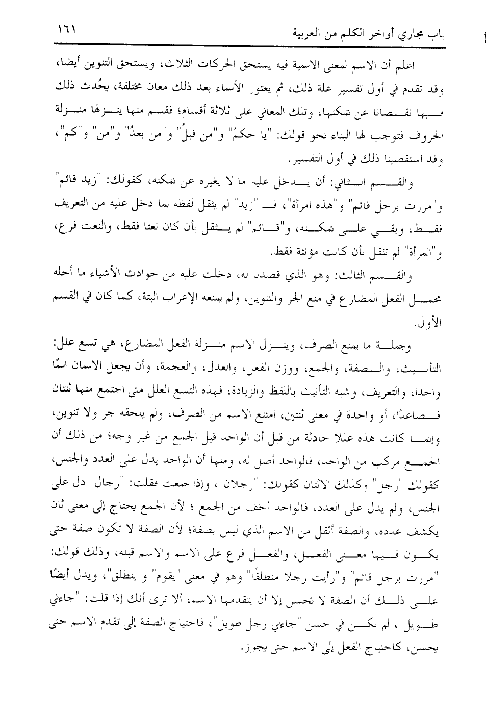 والقسم الثاني: أن يدخل عليه ما لا يغيره عن تمكنه، كقولك: " زيد قائم " و " مررت برجل قائم " و " هذه امرأة "، ف " زيد " لم يثقل لفظه بما دخل عليه من التعريف فقط، وبقي على تمكنه، و " قائم " لم يثقل بأن كان نعتا فقط، والنعت فرع، و " المرأة " لم تثقل بأن كانت مؤنثة فقط.