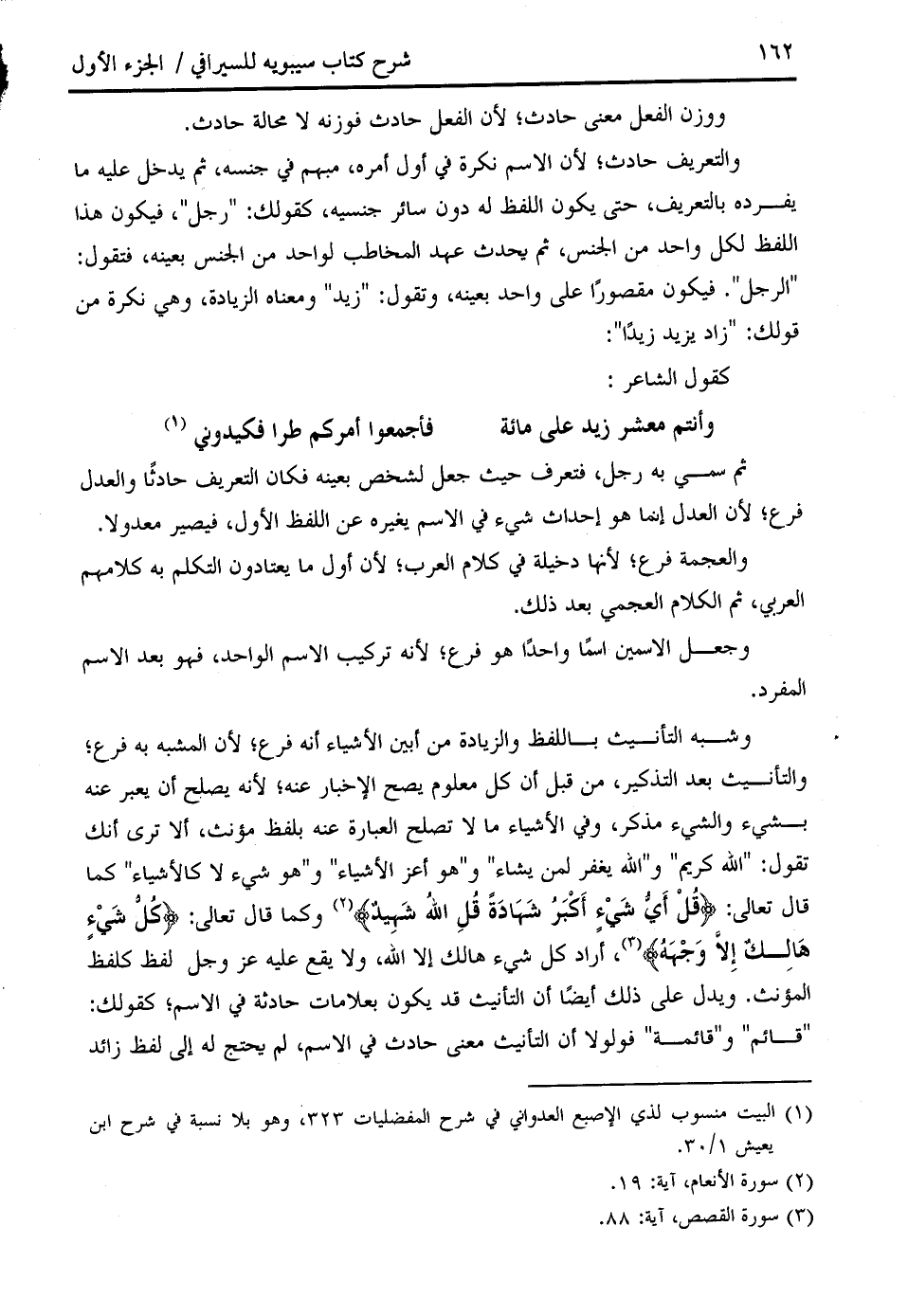 وشبه التأنيث باللفظ والزيادة من أبين الأشياء أنه فرع؛ لأن المشبه به فرع؛ والتأنيث بعد التذكير، من قبل أن كل معلوم يصح الإخبار عنه؛ لأنه يصلح أن يعبر عنه بشيء والشيء مذكر، وفي الأشياء ما لا تصلح العبارة عنه بلفظ مؤنث، ألا ترى أنك تقول: " الله كريم " و " الله يغفر لمن يشاء " و " هو أعز الأشياء " و " هو شيء لا كالأشياء " كما قال تعالى: قُلْ أَيُّ شَيْءٍ أَكْبَرُ شَهادَةً قُلِ اللَّهُ شَهِيدٌ (¬2) وكما قال تعالى: كُلُّ شَيْءٍ هالِكٌ إِلَّا وَجْهَهُ (¬3)، أراد كل شيء هالك إلا الله، ولا يقع عليه عز وجل لفظ كلفظ المؤنث. ويدل على ذلك أيضا أن التأنيث قد يكون بعلامات حادثة في