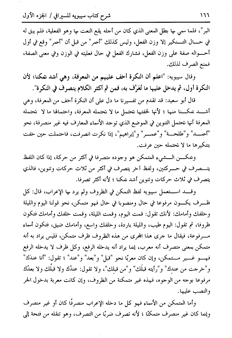 وقال سيبويه: " اعلم أن النكرة أخف عليهم من المعرفة، وهي أشد تمكنا؛ لأن النكرة أول، ثم يدخل عليها ما تعرّف به، فمن ثم أكثر الكلام ينصرف في النكرة ".