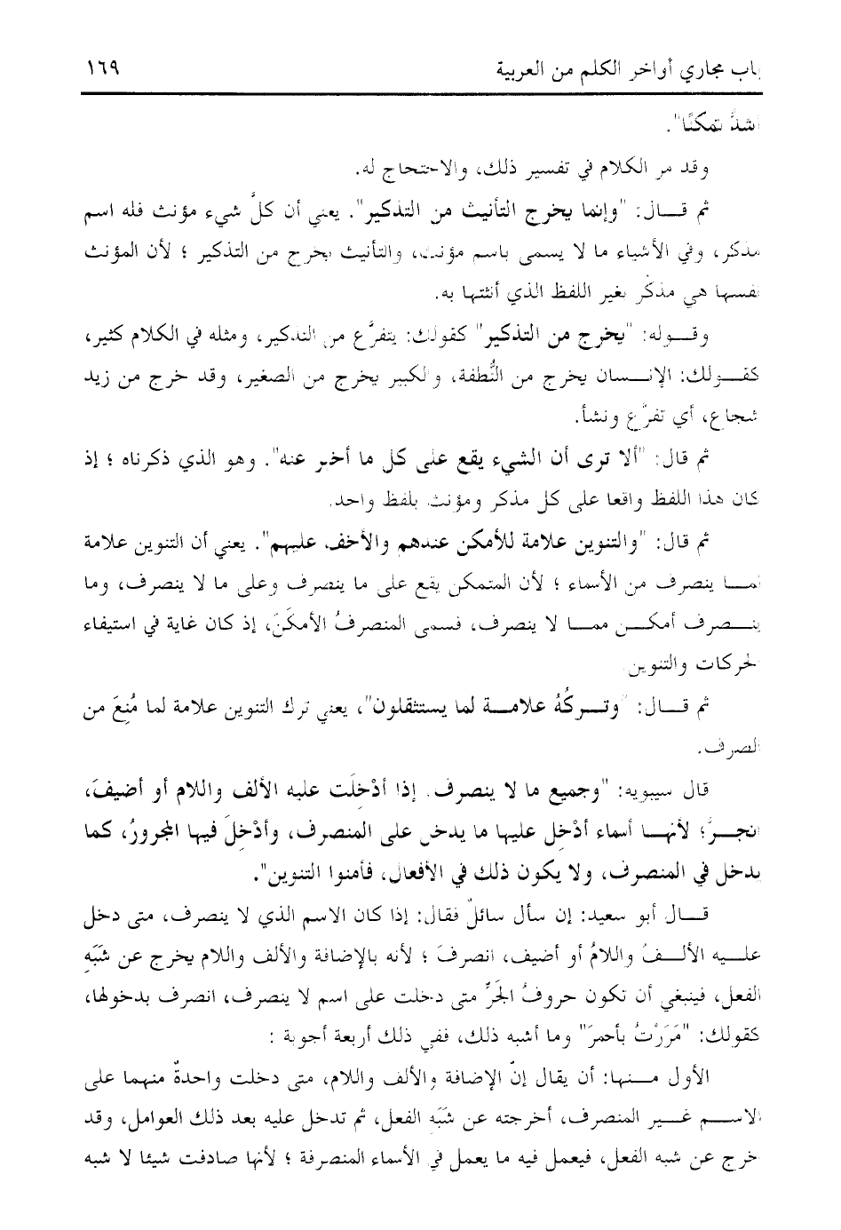 قال أبو سعيد: إن سأل سائل فقال: إذا كان الاسم الذي لا ينصرف، متى دخل عليه الألف واللام أو أضيف، انصرف؛ لأنه بالإضافة والألف واللام يخرج عن شبه الفعل، فينبغي أن تكون حروف الجرّ متى دخلت على اسم لا ينصرف، انصرف بدخولها، كقولك: " مررت بأحمر " وما أشبه ذلك، ففي ذلك أربعة أجوبة: