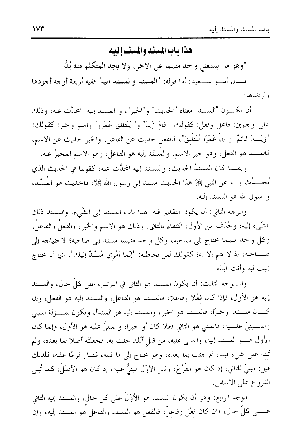 " وهو ما يستغني واحد منهما عن الآخر، ولا يجد المتكلم منه بدّا قال أبو سعيد: أما قوله: " المسند والمسند إليه " ففيه أربعة أوجه أجودها وأرضاها: