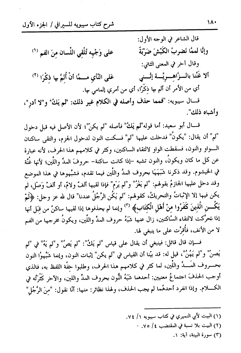 فإن قال قائل: فينبغي أن يقال على قياس " لم يك ": " لم يص " و " لم يه " في " لم يصن " و " لم يهن "، قيل له: قد بيّنا أن القياس في " لم يكن " إثبات النون، وإنما شبّهوا النون بحروف المدّ واللّين، لما كثر في كلامهم هذا الحرف، وطلبوا خفّة اللفظ به، فالذي أوجب الحذف اجتماع معنيين: أحدهما شبه النّون بحروف المدّ واللين، والآخر كثرته في الكلام. وإذا انفرد أحدهما لم يجب الحذف، ولهذا نظائر: منها: أنّا نقول: " من الرّجل "
