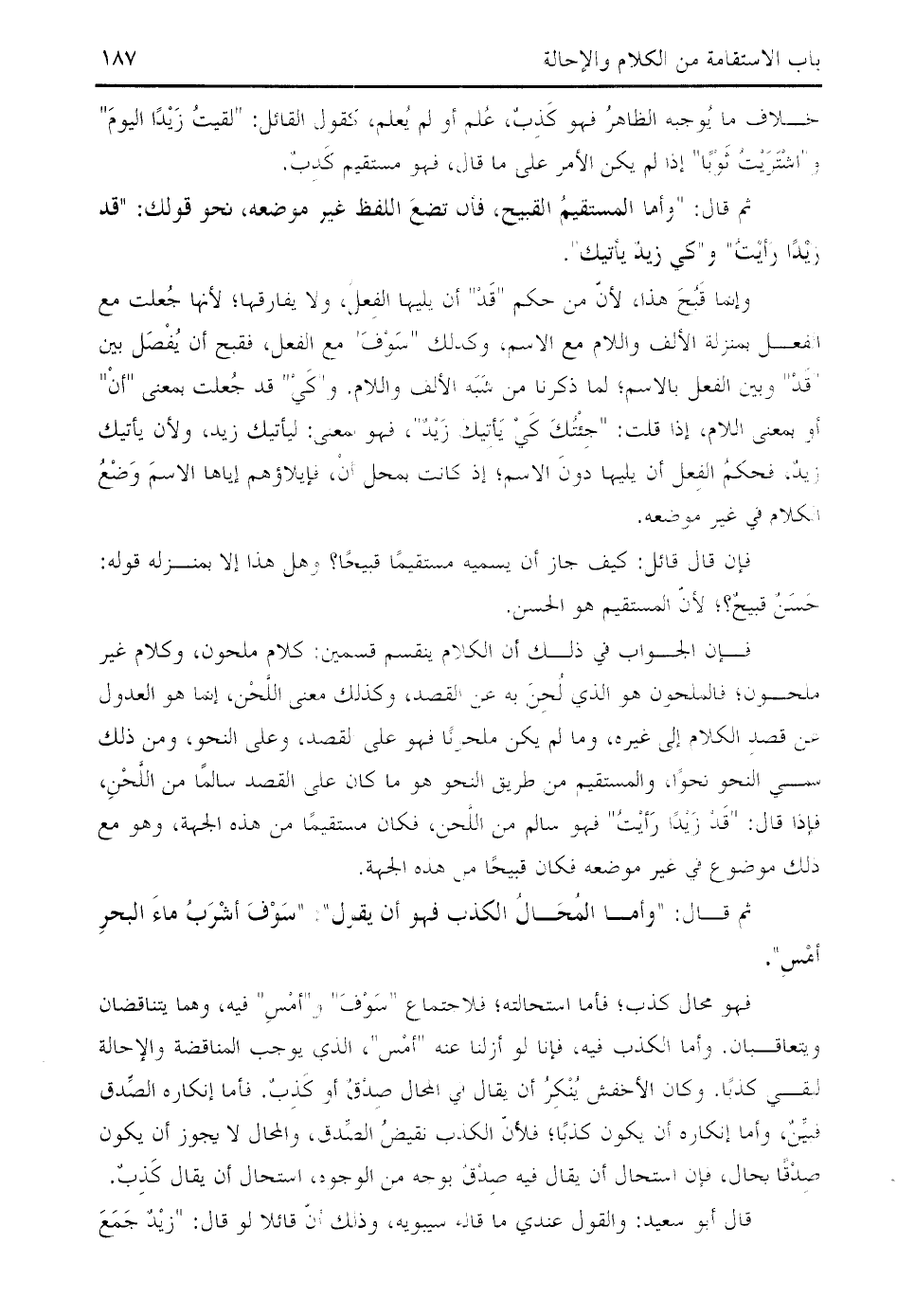 فإن الجواب في ذلك أن الكلام ينقسم قسمين: كلام ملحون، وكلام غير ملحون؛ فالملحون هو الذي لحن به عن القصد، وكذلك معنى اللّحن، إنما هو العدول عن قصد الكلام إلى غيره، وما لم يكن ملحونا فهو على القصد، وعلى النحو، ومن ذلك سمي النحو نحوا، والمستقيم من طريق النحو هو ما كان على القصد سالما من اللّحن، فإذا قال: " قد زيدا رأيت " فهو سالم من اللّحن، فكان مستقيما من هذه الجهة، وهو مع ذلك موضوع في غير موضعه فكان قبيحا من هذه الجهة.