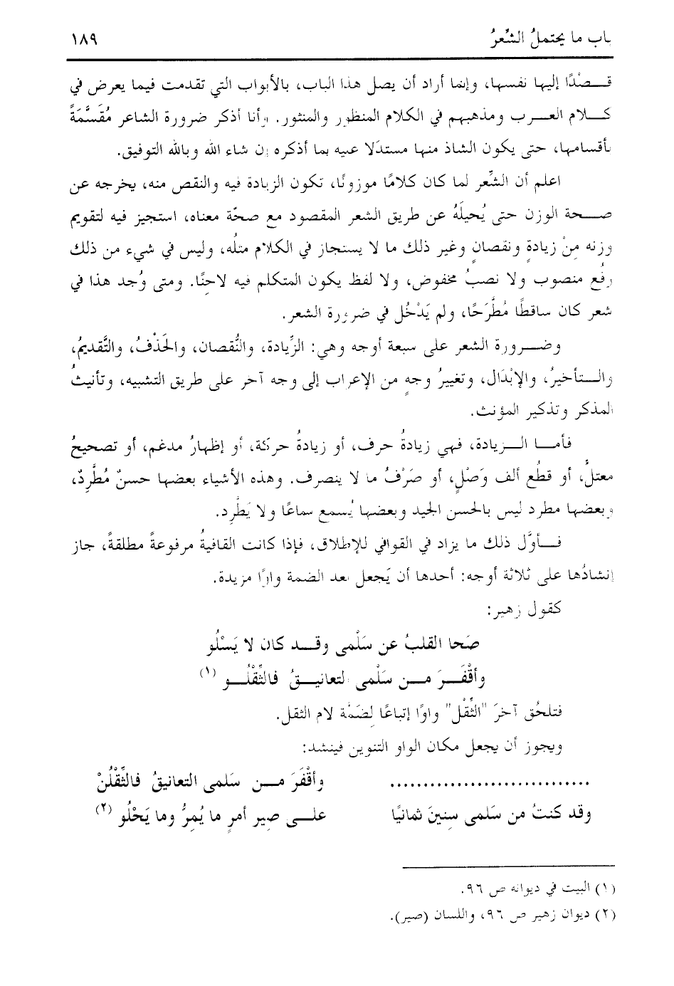 اعلم أن الشّعر لما كان كلاما موزونا، تكون الزيادة فيه والنقص منه، يخرجه عن صحة الوزن حتى يحيله عن طريق الشعر المقصود مع صحّة معناه، استجيز فيه لتقويم وزنه من زيادة ونقصان وغير ذلك ما لا يستجاز في الكلام مثله، وليس في شيء من ذلك رفع منصوب ولا نصب مخفوض، ولا لفظ يكون المتكلم فيه لاحنا. ومتى وجد هذا في شعر كان ساقطا مطّرحا، ولم يدخل في ضرورة الشعر.