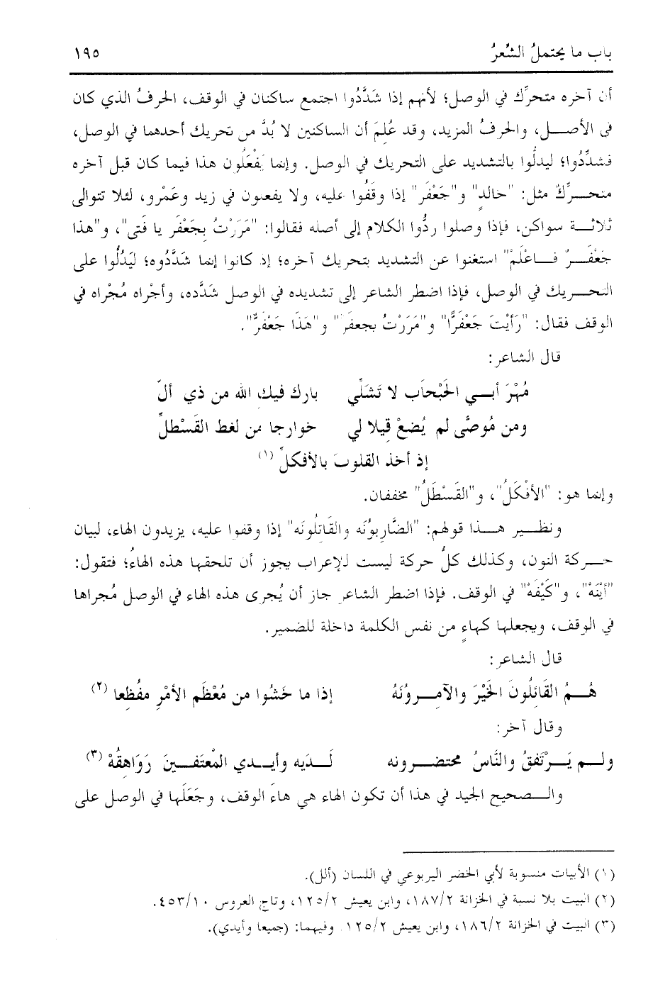 ونظير هذا قولهم: " الضّاربونه والقاتلونه " إذا وقفوا عليه، يزيدون الهاء، لبيان حركة النون، وكذلك كلّ حركة ليست للإعراب يجوز أن تلحقها هذه الهاء؛ فتقول: