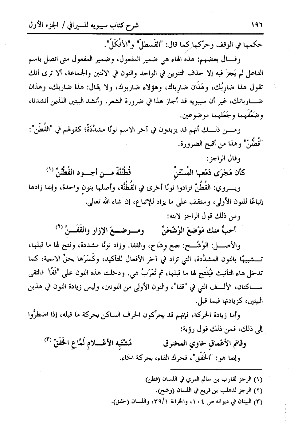 والأصل: الوشح: جمع وشاح، والقفا. وزاد نونا مشددة، وفتح لها ما قبلها، تشبيها بالنون المشدّدة، التي تزاد في آخر الأفعال للتأكيد، وكسرها بحقّ الاسمية، كما تدخل هاء التأنيث فيفتح لها ما قبلها، ثم تعرب هي. ودخلت هذه النون على " قفا " فالتقى ساكنان، الألف التي في " قفا "، والنون الأولى من النونين، وليس زيادة النون في هذين البيتين، كزيادتها فيما قبل.