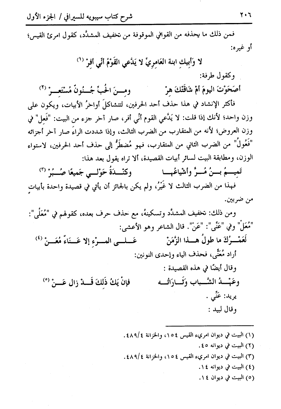 فأكثر الإنشاد في هذا حذف أحد الحرفين، لتتشاكل أواخر الأبيات، ويكون على وزن واحد؛ لأنك إذا قلت: لا يدّعي القوم أنّي أفر، صار آخر جزء من البيت: " فعل " في وزن العروض؛ لأنه من المتقارب من الضرب الثالث، وإذا شددت الراء صار آخر أجزائه " فعول " من الضرب الثاني من المتقارب، فهو مضطرّ إلى حذف أحد الحرفين، لاستواء الوزن، ومطابقة البيت لسائر أبيات القصيدة، ألا تراه يقول بعد هذا: