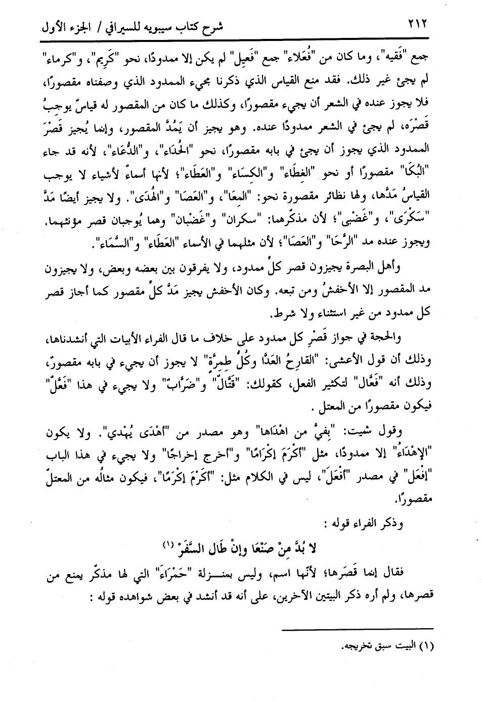 جمع " فقيه "، وما كان من " فعلاء " جمع " فعيل " لم يكن إلا ممدودا، نحو " كريم "، و " كرماء " لم يجئ غير ذلك. فقد منع القياس الذي ذكرنا مجيء الممدود الذي وصفناه مقصورا، فلا يجوز عنده في الشعر أن يجيء مقصورا، وكذلك ما كان من المقصور له قياس يوجب قصره، لم يجئ في الشعر ممدودا عنده. وهو يجيز أن يمدّ المقصور، وإنما يجيز قصر الممدود الذي يجوز أن يجئ في بابه مقصورا، نحو " الحداء "، و " الدّعاء "، لأنه قد جاء " البكا " مقصورا أو نحو " الغطاء " و " الكساء " و " العطاء "؛ لأنها أسماء لأشياء لا يوجب القياس مدّها، ولها نظائر مقصورة نحو: " المعا "، و " العصا "، و " الهدى ". ولا يجيز أيضا مدّ " سكرى "، و " غضبى "؛ لأن مذكّرهما: " سكران " و " غضبان " وهما يوجبان قصر مؤنثهما.