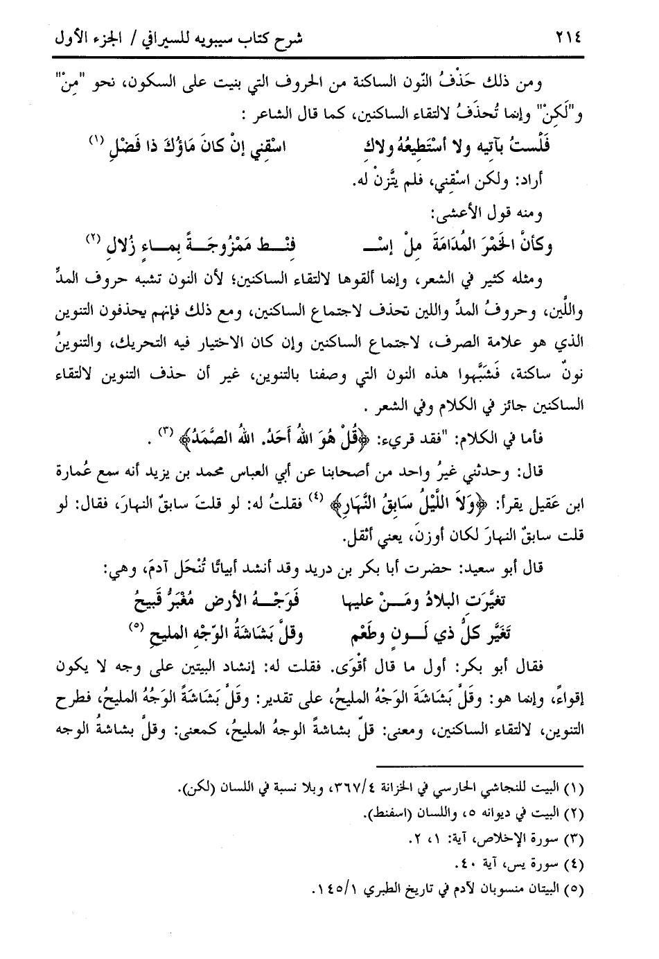 ومثله كثير في الشعر، وإنما ألقوها لالتقاء الساكنين؛ لأن النون تشبه حروف المدّ واللّين، وحروف المدّ واللين تحذف لاجتماع الساكنين، ومع ذلك فإنهم يحذفون التنوين الذي هو علامة الصرف، لاجتماع الساكنين وإن كان