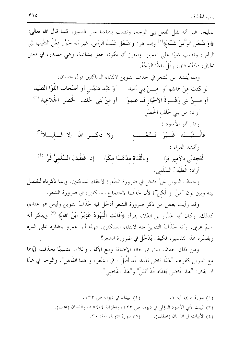 ومن ذلك حذف الياء في حالة الإضافة ومع الألف واللام، تشبيها بحذفهم إيّاها مع التنوين كقولهم " هذا قاض بغداد قد أقبل "، في الشّعر، و " هذا القاض ". والوجه في هذا أن يقال: " هذا قاضي بغداد قد أقبل " و " هذا القاضي ".