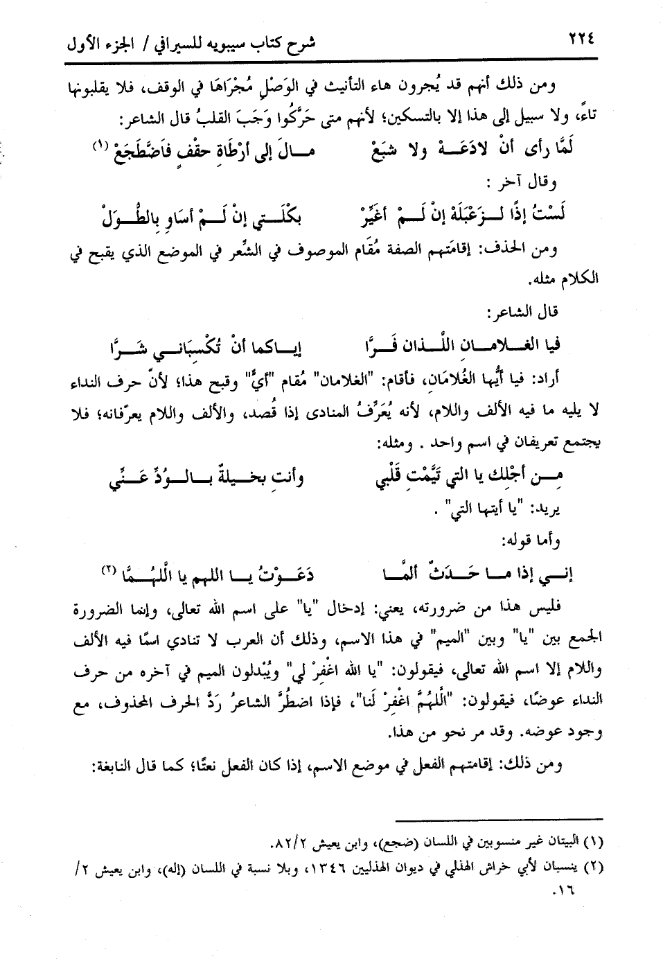 فليس هذا من ضرورته، يعني: إدخال " يا " على اسم الله تعالى، وإنما الضرورة الجمع بين " يا " وبين " الميم " في هذا الاسم، وذلك أن العرب لا تنادي اسما فيه الألف واللام إلا اسم الله تعالى، فيقولون: " يا الله اغفر لي " ويبدلون الميم في آخره من حرف النداء عوضا، فيقولون: " اللهمّ اغفر لنا "، فإذا اضطرّ الشاعر ردّ الحرف المحذوف، مع وجود عوضه. وقد مر نحو من هذا.
