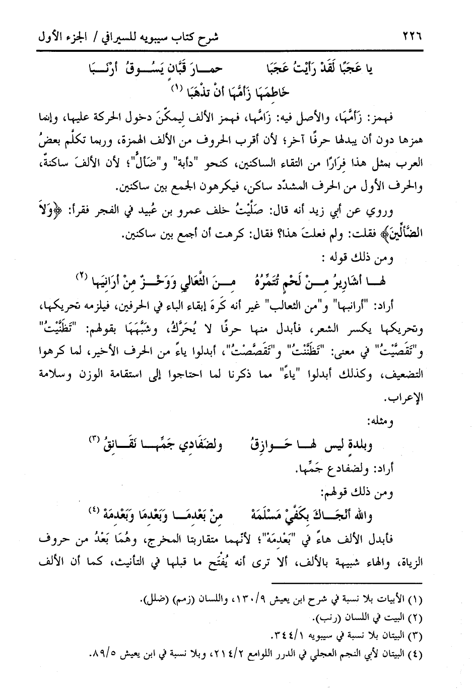 أراد: " أرانبها " و " من الثعالب " غير أنه كره إبقاء الباء في الحرفين، فيلزمه تحريكها، وتحريكها يكسر الشعر، فأبدل منها حرفا لا يحرّك، وشبّهها بقولهم: " تظنّيت " و " تقصّيت " في معنى: " تظنّنت " و " تقصّصت "، أبدلوا ياء من الحرف الأخير، لما كرهوا التضعيف، وكذلك أبدلوا " ياء " مما ذكرنا لما احتاجوا إلى استقامة الوزن وسلامة الإعراب.