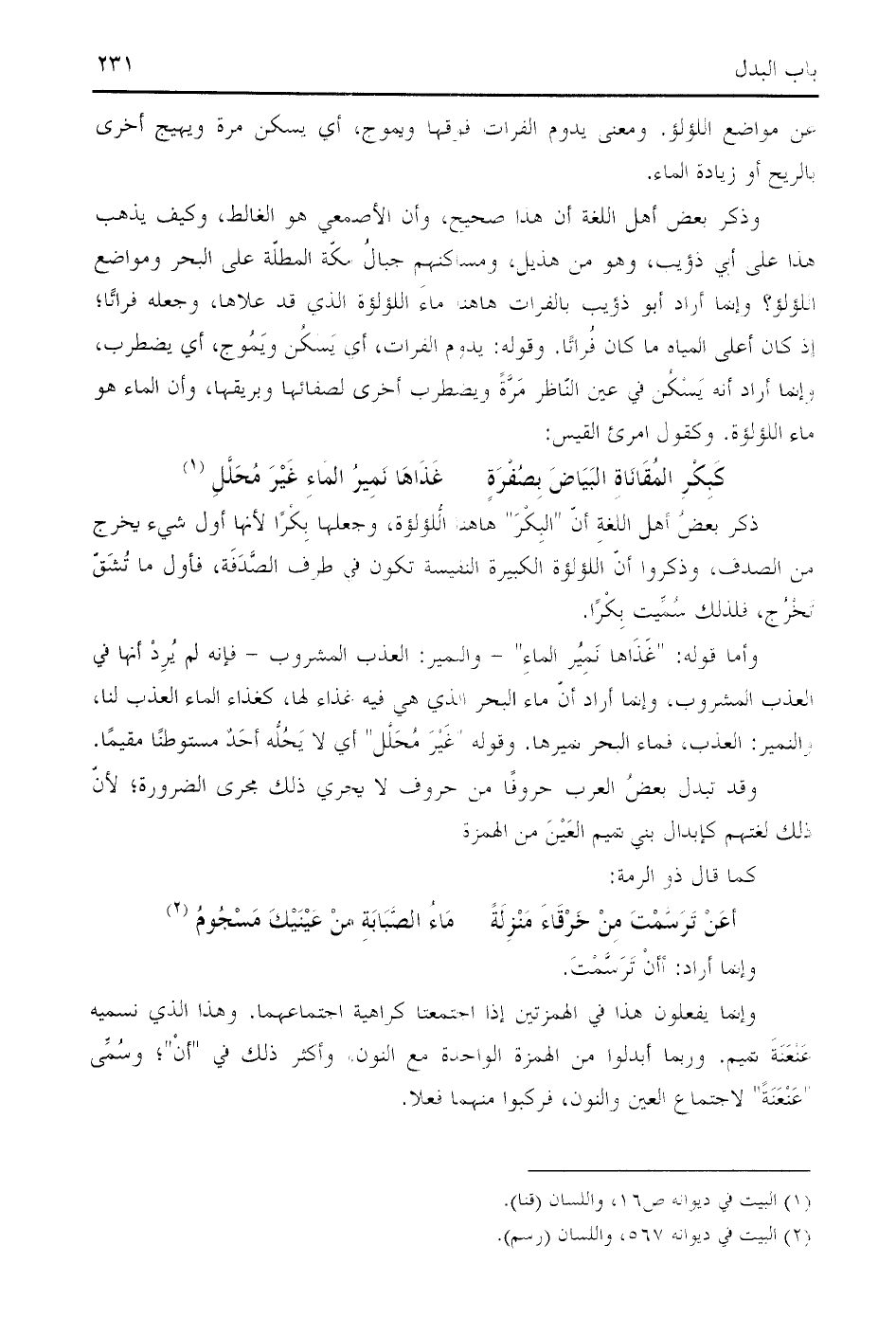 وذكر بعض أهل اللغة أن هذا صحيح، وأن الأصمعي هو الغالط، وكيف يذهب هذا على أبي ذؤيب، وهو من هذيل، ومساكنهم جبال مكّة المطلّة على البحر ومواضع اللؤلؤ؟ وإنما أراد أبو ذؤيب بالفرات هاهنا ماء اللؤلؤة الذي قد علاها، وجعله فراتا؛ إذ كان أعلى المياه ما كان فراتا. وقوله: يدوم الفرات، أي يسكن ويموج، أي يضطرب، وإنما أراد أنه يسكن في عين النّاظر مرّة ويضطرب أخرى لصفائها وبريقها، وأن الماء هو ماء اللؤلؤة. وكقول امرئ القيس: