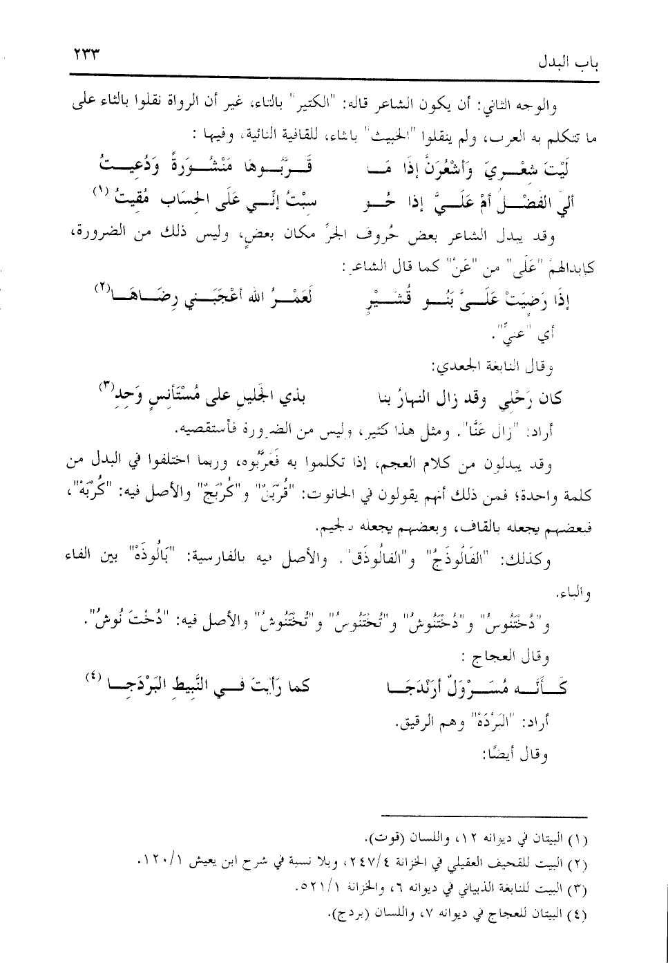 والوجه الثاني: أن يكون الشاعر قاله: " الكتير " بالتاء، غير أن الرواة نقلوا بالثاء على ما تتكلم به العرب، ولم ينقلوا " الخبيث " بالثاء، للقافية التائية، وفيها: