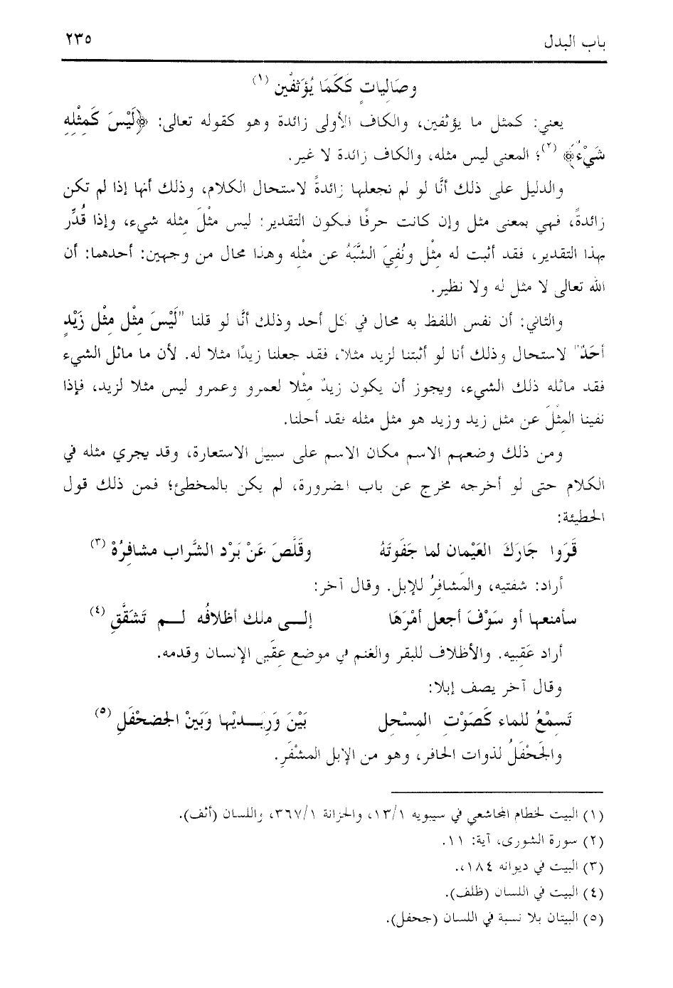 والثاني: أن نفس اللفظ به محال في كل أحد وذلك أنّا لو قلنا " ليس مثل مثل زيد أحد " لاستحال وذلك أنا لو أثبتنا لزيد مثلا، فقد جعلنا زيدا مثلا له. لأن ما ماثل الشيء فقد ماثله ذلك الشيء، ويجوز أن يكون زيد مثلا لعمرو وعمرو ليس مثلا لزيد، فإذا نفينا المثل عن مثل زيد وزيد هو مثل مثله فقد أحلنا.