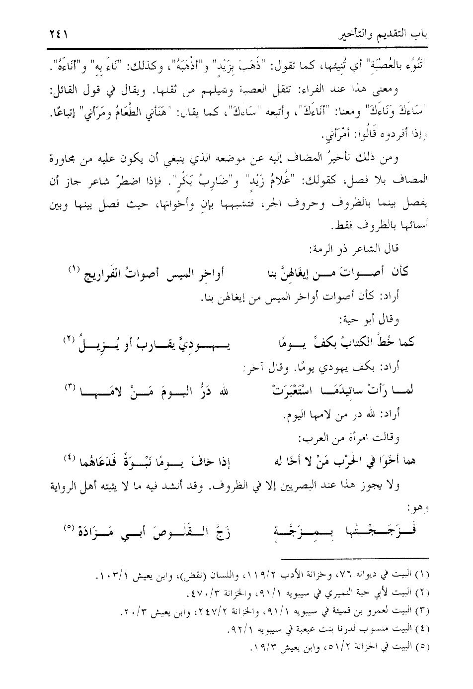 ومن ذلك تأخير المضاف إليه عن موضعه الذي ينبغي أن يكون عليه من مجاورة المضاف بلا فصل، كقولك: " غلام زيد " و " ضارب بكر ". فإذا اضطرّ شاعر جاز أن يفصل بينما بالظروف وحروف الجر، فتشبهها بإن وأخواتها، حيث فصل بينها وبين أسمائها بالظروف فقط.