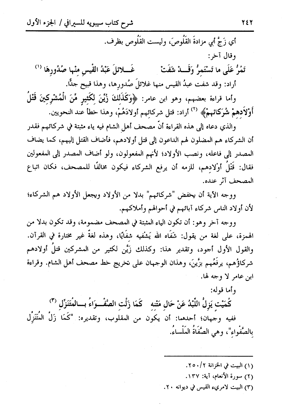 والقول الأول أجود، وتقدير هذا: وكذلك زيّن لكثير من المشركين قتل أولادهم شركاؤهم، يرفعهم بزّين، وهذان الوجهان على تخريج خط مصحف أهل الشام. وقراءة ابن عامر لا وجه لها.
