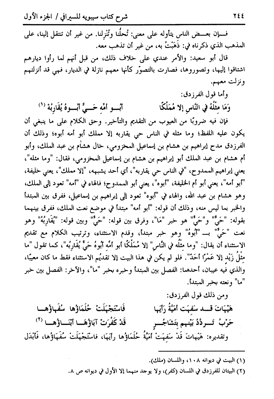 فإن فيه ضروبا من العيوب من التقديم والتأخير. وحق الكلام على ما ينبغي أن يكون عليه اللفظ؛ وما مثله في الناس حي يقاربه إلا مملك أبو أمه أبوه؛ وذلك أن الفرزدق مدح إبراهيم بن هشام بن إسماعيل المخزومي، خال هشام بن عبد الملك، وأبو أم هشام بن عبد الملك أبو إبراهيم بن هشام بن إسماعيل المخزومي، فقال: " وما مثله "، يعني إبراهيم الممدوح، " في الناس حي يقاربه "، أي أحد يشبهه، " إلا مملك "، يعني خليفة، " أبو أمه "، يعني أبو أم الخليفة، " أبوه "، يعني أبو الممدوح؛ فالهاء في " أمه " تعود إلى الملك، وهو هشام بن عبد الله، والهاء في " أبوه " تعود إلى إبراهيم بن إسماعيل، ففرق بين المبتدأ والخبر بما ليس منه، وذلك أن قوله: " أبو أمه " مبتدأ في موضع نعت الملك، ففرق بينهما بقوله: " حيّ " و " حيّ " هو خبر " ما "، وفرق بين قوله: " حيّ " وبين قوله: " يقاربه " وهو نعت " حيّ " ب " أبوه " وهو خبر مبتدأ، وقدم الاستثناء، وترتيب الكلام مع تقديم الاستثناء أن يقال: " وما مثله في النّاس " إلا مملّكا أبو أمّه أبوه حيّ يقاربه "، كما تقول " ما مثل زيد إلا عمرا أحد ". فلو لم يكن في هذا البيت إلا تقديم الاستثناء فقط ما كان معيبا، والذي فيه عيبان، أحدهما: الفصل بين المبتدأ وخبره بخبر " ما "، والآخر: الفصل بين خبر " ما " ونعته بخبر المبتدأ.