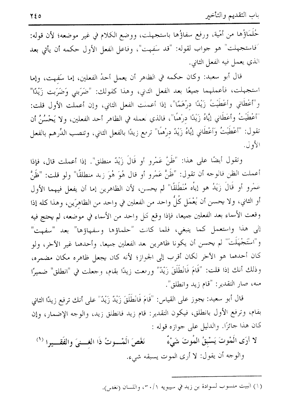 قال أبو سعيد: وكان حكمه في الظاهر أن يعمل أحد الفعلين، إما سفهت، وإما استجهلت، فأعملهما جميعا بعد الفعل الثاني، وهذا كقولك: " ضربني وضربت زيدا " و " أعطاني وأعطيت زيدا درهما "، إذا أعملت الفعل الثاني، وإن أعملت الأول قلت: