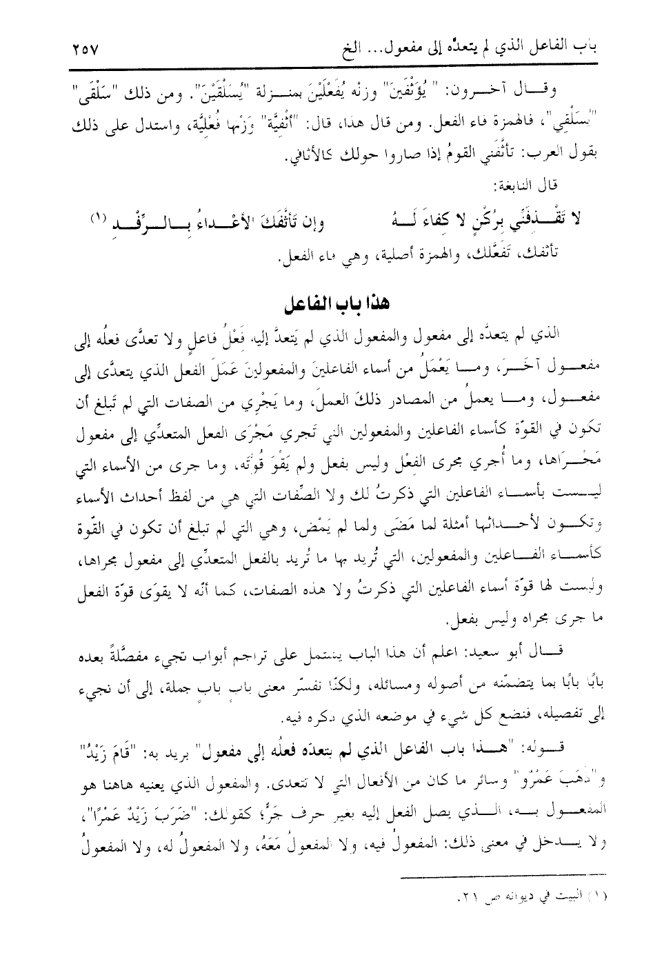 الذي لم يتعدّه إلى مفعول والمفعول الذي لم يتعدّ إليه فعل فاعل ولا تعدّى فعله إلى مفعول آخر، وما يعمل من أسماء الفاعلين والمفعولين عمل الفعل الذي يتعدّى إلى مفعول، وما يعمل من المصادر ذلك العمل، وما يجري من الصفات التي لم تبلغ أن تكون في القوّة كأسماء الفاعلين والمفعولين التي تجري مجرى الفعل المتعدّي إلى مفعول مجراها، وما أجري مجرى الفعل وليس بفعل ولم يقو قوّته، وما جرى من الأسماء التي ليست بأسماء الفاعلين التي ذكرت لك ولا الصّفات التي هي من لفظ أحداث الأسماء وتكون لأحداثها أمثلة لما مضى ولما لم يمض، وهي التي لم تبلغ أن تكون في القوّة كأسماء الفاعلين والمفعولين، التي تريد بها ما تريد بالفعل المتعدّي إلى مفعول مجراها، وليست لها قوّة أسماء الفاعلين التي ذكرت ولا هذه الصفات، كما أنّه لا يقوى قوّة الفعل ما جرى مجراه وليس بفعل.